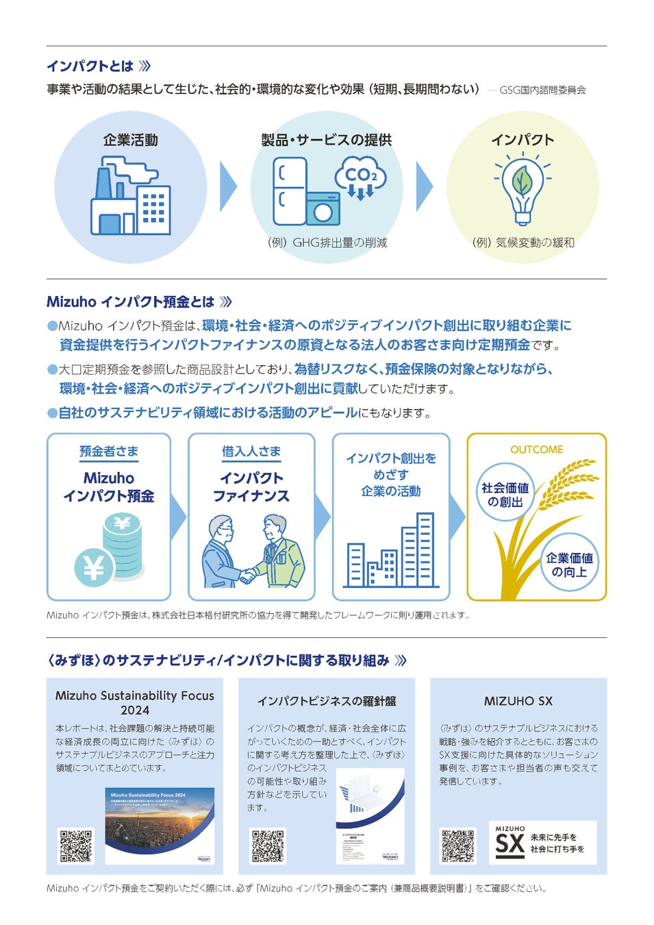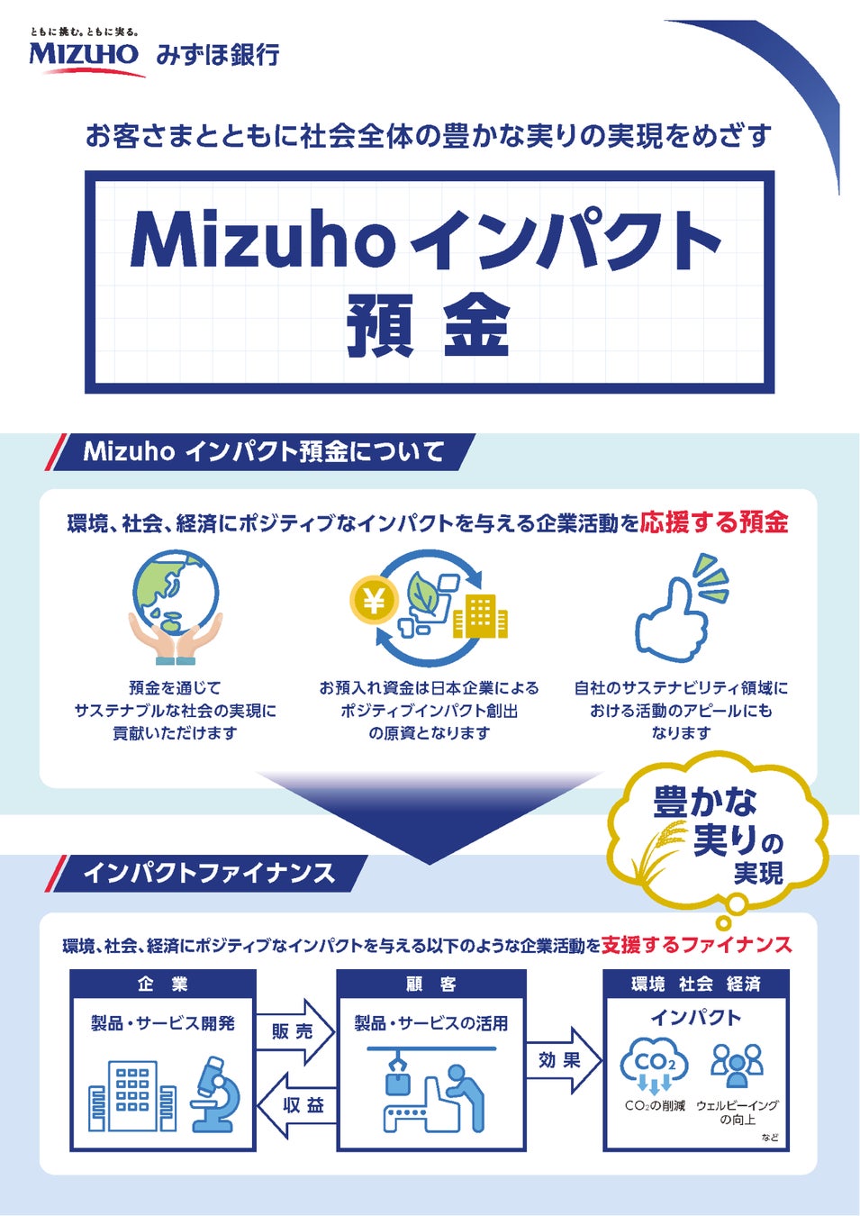 当社は、持続可能な社会の実現に貢献することを重要な企業姿勢のひとつとして掲げています。その方針に基づき、みずほ銀行の「Mizuho インパクト預金」に賛同し、預け入れを行いました。