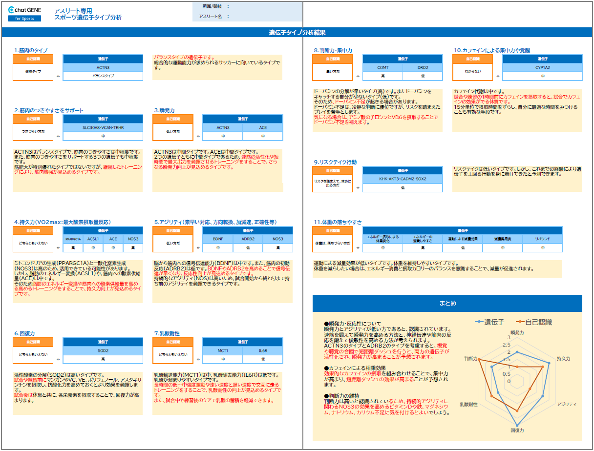 スポーツに関わる30以上の遺伝子解析の結果と本人の自己認識を照らし合わせることで、強化すべきポイントや最適なトレーニング方針、栄養管理を提案します。