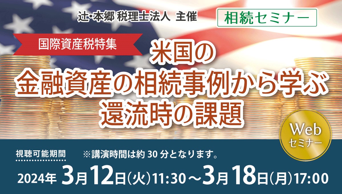 辻・本郷 税理士法人(本社:東京都新宿区、理事長:徳田孝司)は、2024年3月12日(火)より「【相続セミナー】国際資産税特集 米国の金融資産の相続事例から学ぶ還流時の課題」を開催いたします。海外相続で遺言や遺産分割協議書がやっと整ったにも拘らず、いざ相続した海外財産を日本に送る際に一筋縄ではいかないことがあります。本セミナーでは、弊社がお手伝いした米国の金融資産の相続事例から、還流に関するリアルな課題をご紹介します。