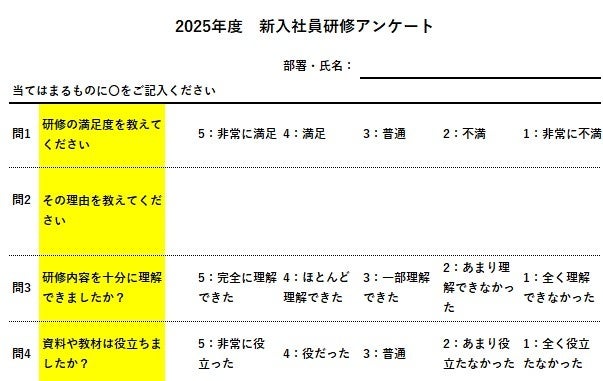 これから新入社員研修のアンケートを作成される方はもちろん、既存のアンケートの見直しをお考えの方にもお役立ていただけます。是非、新入社員研修の成功に向けて、こちらのアンケートテンプレートをご活用いただければ幸いです。