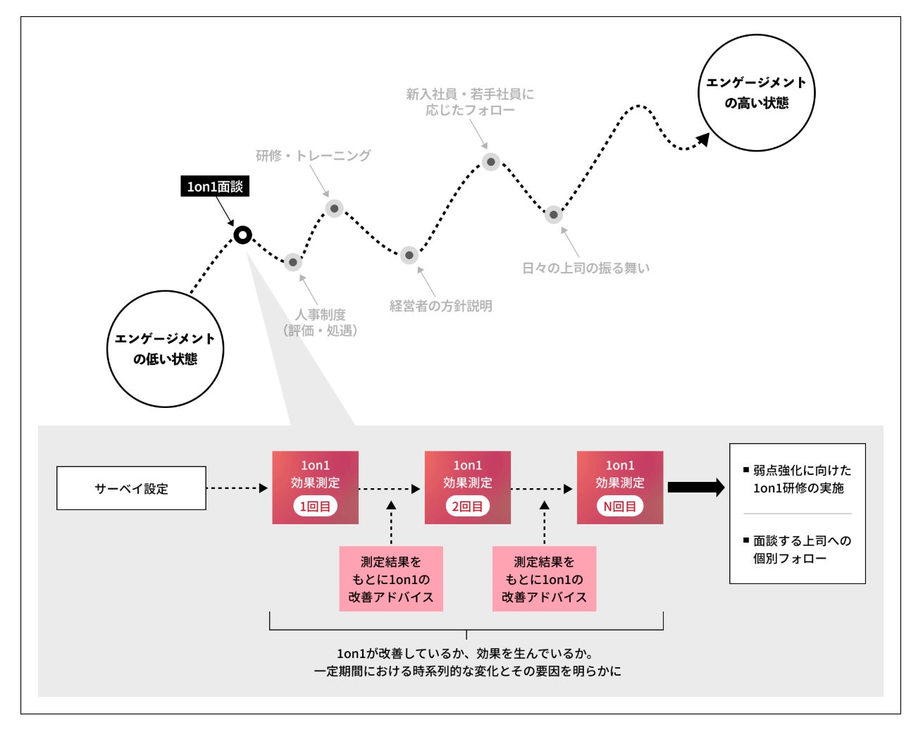 1ON1という面談の効果だけを捉えるのではなく、上司が行う日々の組織運営、マネジメント活動との関係性をも捉えたうえで、1ON1の価値や効果、改善点を知ることができます。