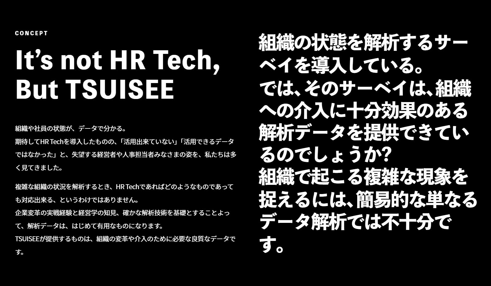 TSUISEEは、①自社の人や組織の問題を深いレベルで解明すること、②組織の問題に対する打ち手である人事施策の価値や効果を科学的に解明すること、の2つを同時に行うことができるツールです。リリース時から「他とは一線を画する」ツールとして好評を得てきました。