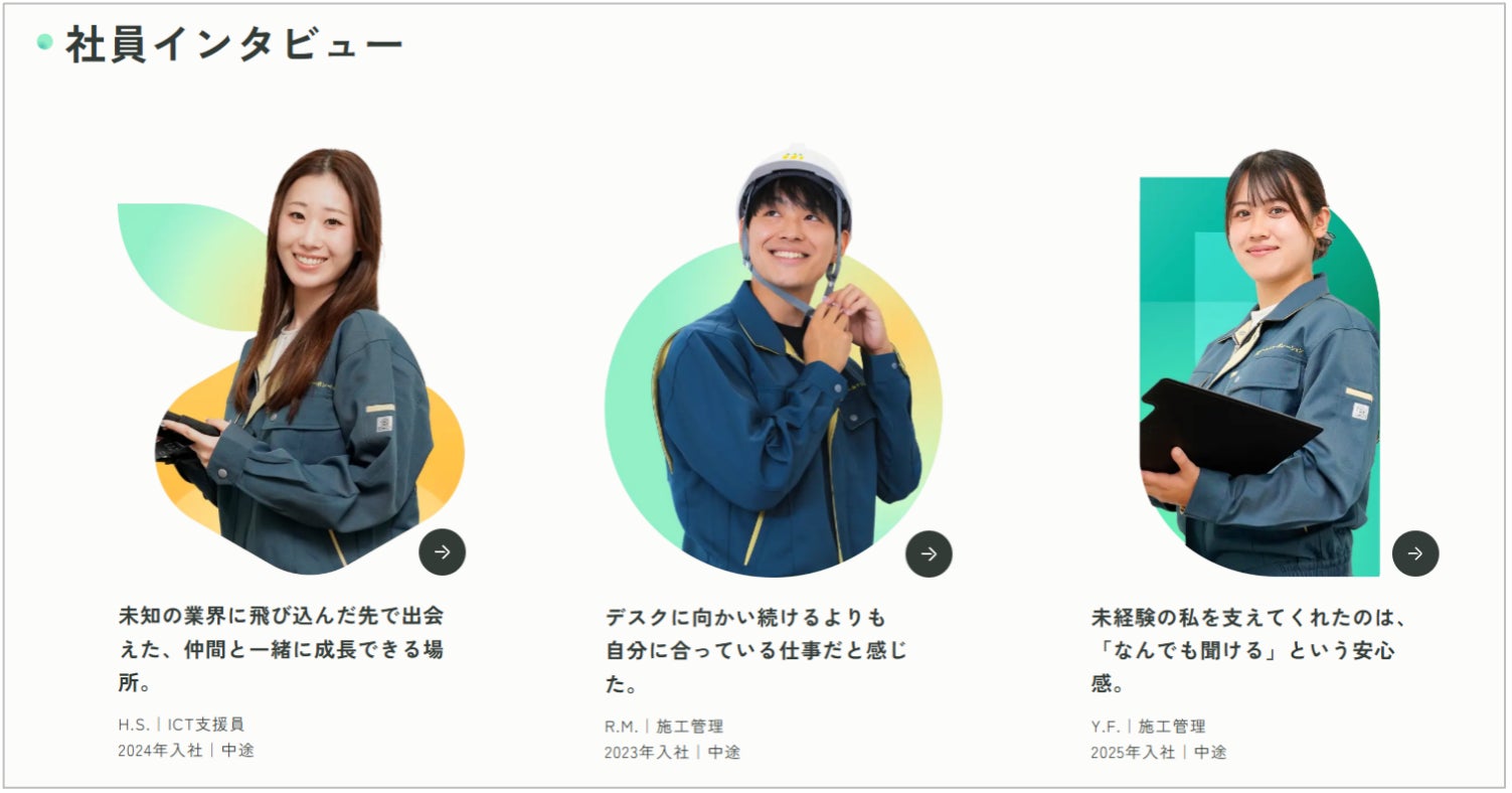 建設業界で働くリアルな働き方を様々なテーマで掲載し、働くイメージを可視化。ページだけではなく動画も公開することで、働いている社員の雰囲気も伝わるように意識しました。