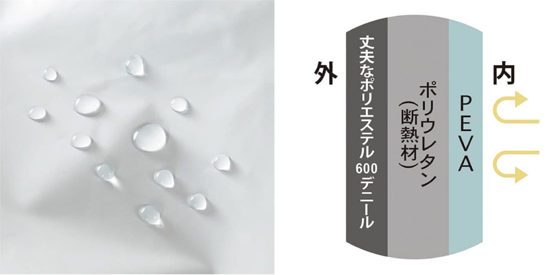 耐久性に優れ防水性能が高いPEVA(ポリエチレン酢酸ビニール)素材をバッグ内側に使用した、三層構造の保冷保温に優れたトートバッグです。外側には小物が取り出しやすいようファスナー付きのポケットを。表裏両面にプリント可能です。サイズはS・M・Lの3種類。ブラックのおしゃれなツートーンをお楽しみください。