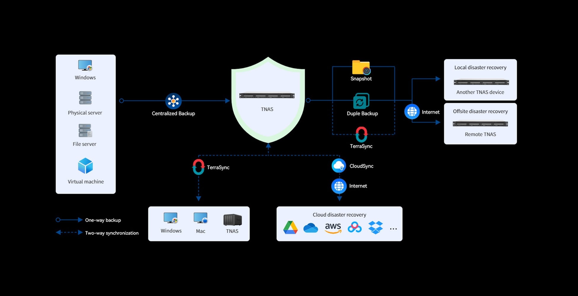 BBSは、プロフェッショナルなストレージ管理システム、高度なバックアップツール、堅牢なハードウェアプラットフォームを統合しており、柔軟かつ高度なバックアップ機能を提供します。主要コンポーネントには、オフサイト災害対策用「Duple Backup」、PC・サーバー向け集中管理型バックアップ「Centralized Backup」、複数デバイス間の同期「TerraSync」、クラウドとの同期・復旧を可能にする「CloudSync」、ランサムウェア対策としてのスナップショット機能「Snapshot」などが含まれています。