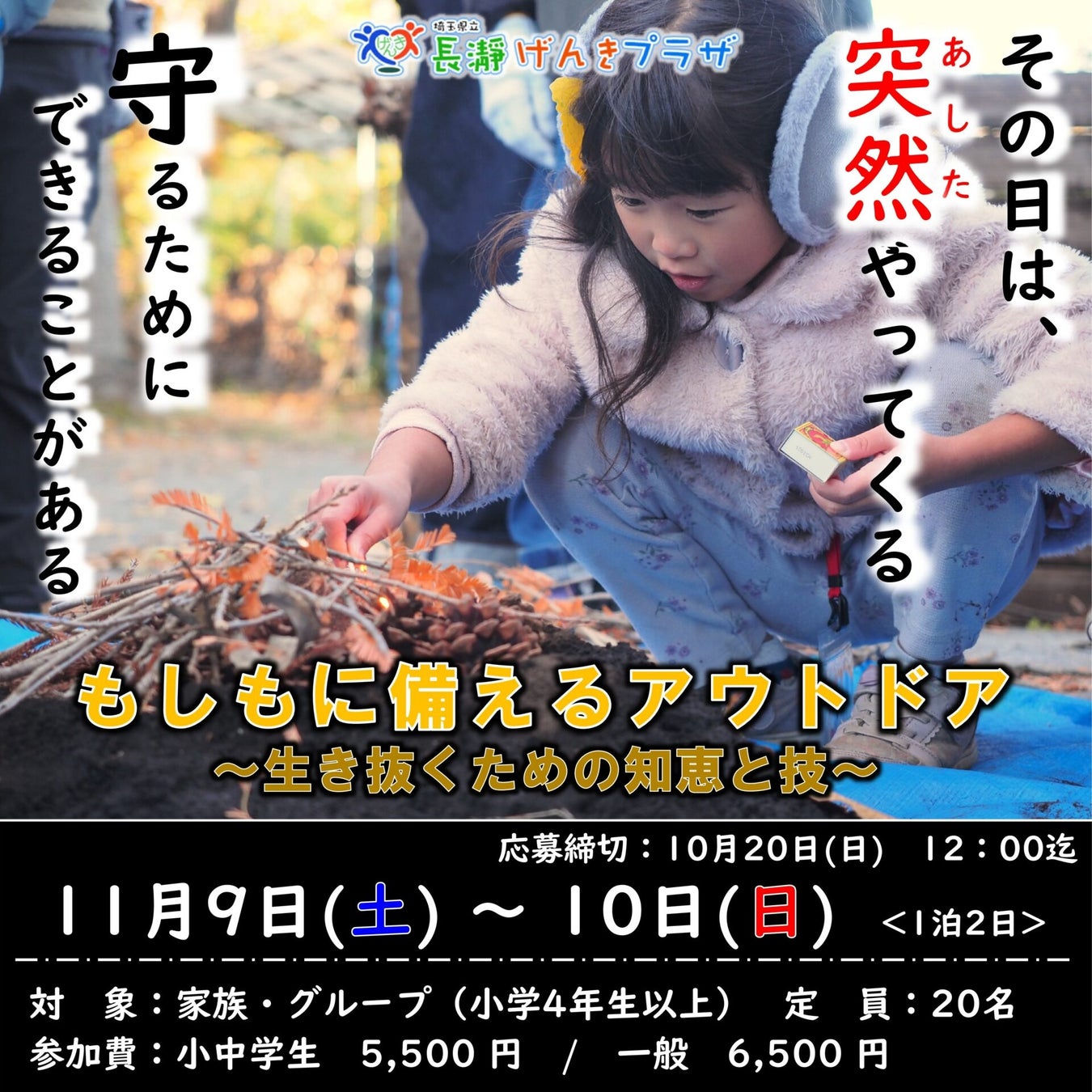 埼玉県立長瀞げんきプラザ(指定管理者株式会社サンアメニティ)は令和6年11/9-10に「アウトドア×防災」をテーマにした体験講座を1泊2日で開催します!もしもの時に役立つ知識を体験してみましょう!