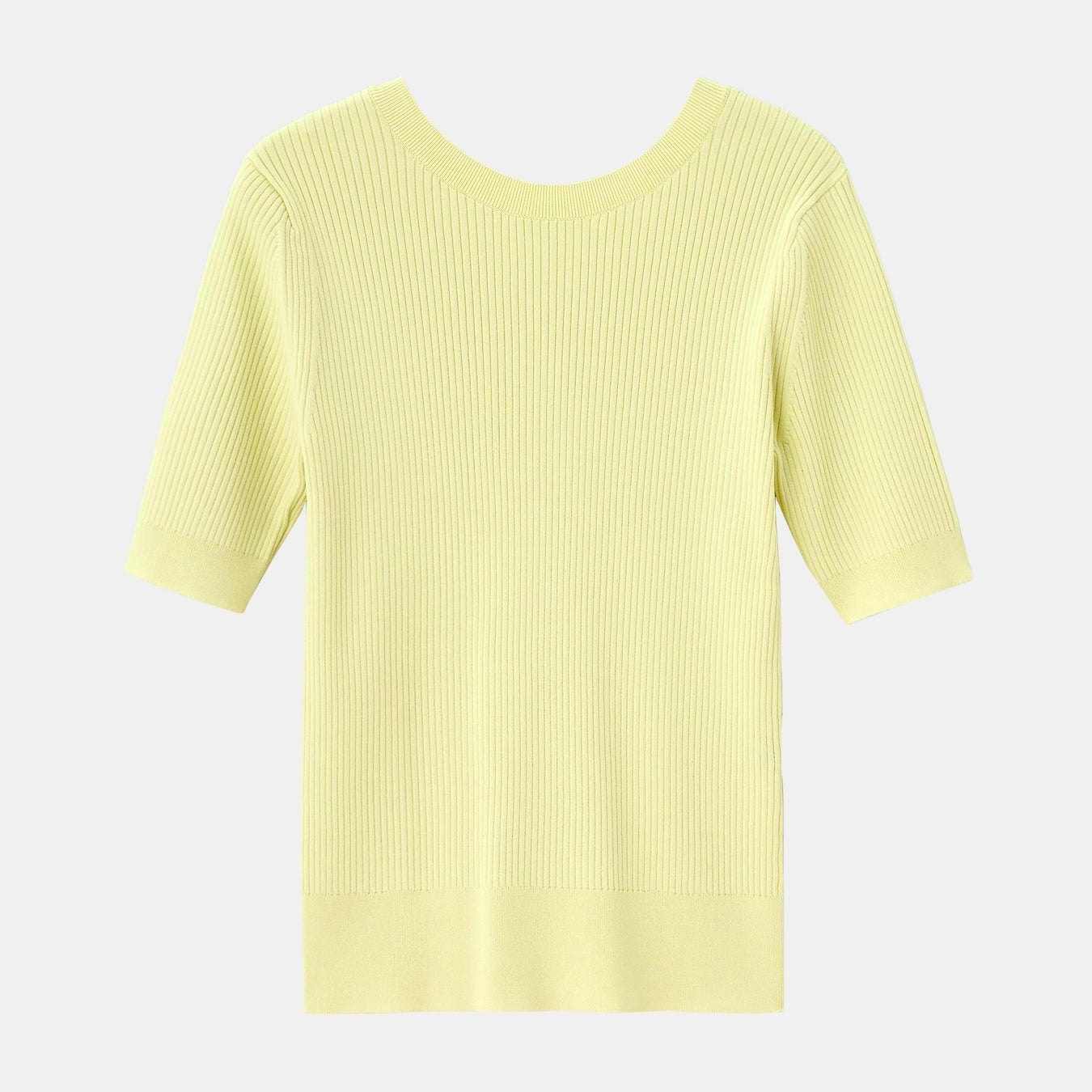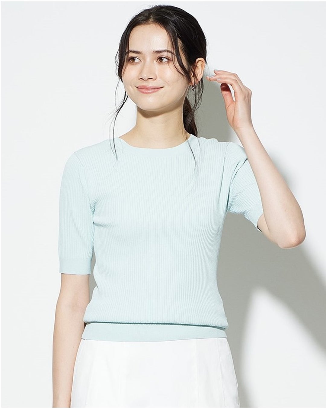 「UVカットレーヨンブレンド2WAYセーター」は、クルーネックとVネックの前後2WAY仕様で、一枚で印象を変えられる5分袖セーターです。肘上まである袖丈で二の腕を自然にカバーし、スタイルアップを叶えます。コンパクトなニットですが、適度なリブの太さで身体のラインが目立ちにくく、上半身をすっきりと見せます。