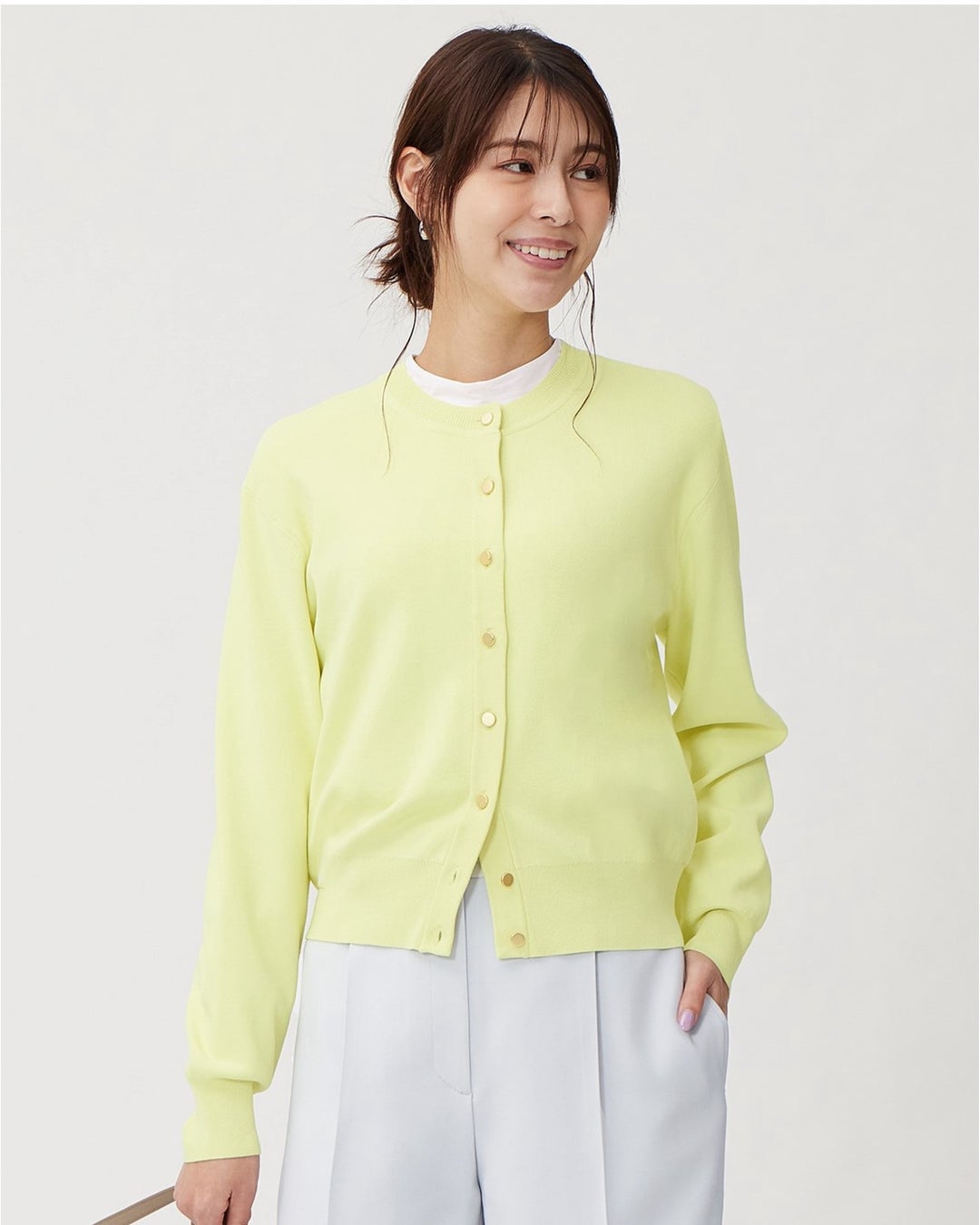 「UVカットニットシリーズ」は、豊富なカラーバリエーションも人気の理由の一つです。今シーズンは、ベーシックカラーからトレンドカラーまで最大で8色を展開します。なかでもおすすめは、新色の春らしいパステル調のイエロー、ピンク、ブルー。優しいトーンで着ると顔色を明るく見せてくれます。派手すぎず、きれいめなボトムとの相性も良いため、きちんと見せたいオフィスシーンにも馴染みます。
