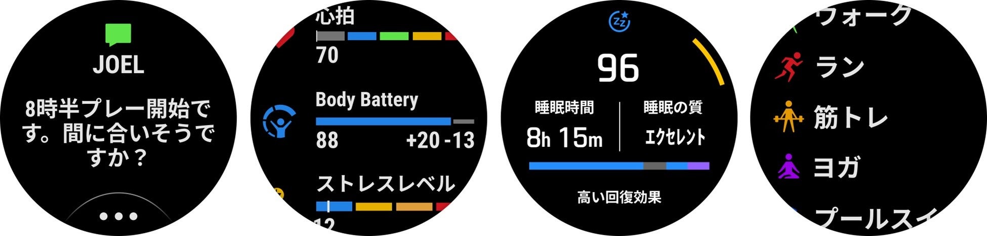 睡眠の質を0〜100までの数値で確認できる「睡眠スコア」や呼吸計測、心拍数、呼吸数、歩数、消費カロリー、体のエネルギー状態を数値化する独自の指標Body Battery、ストレスレベル機能など多彩なセンサーで心身の状態をデータ化します。