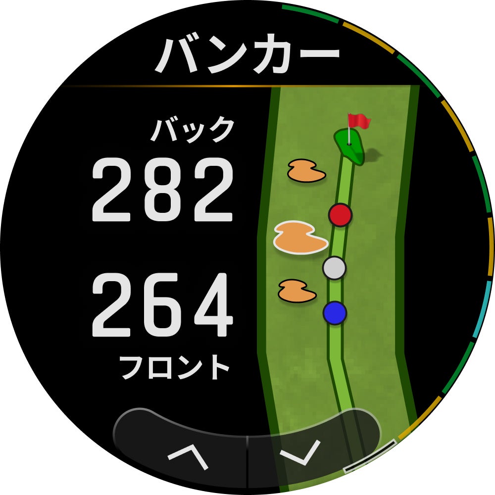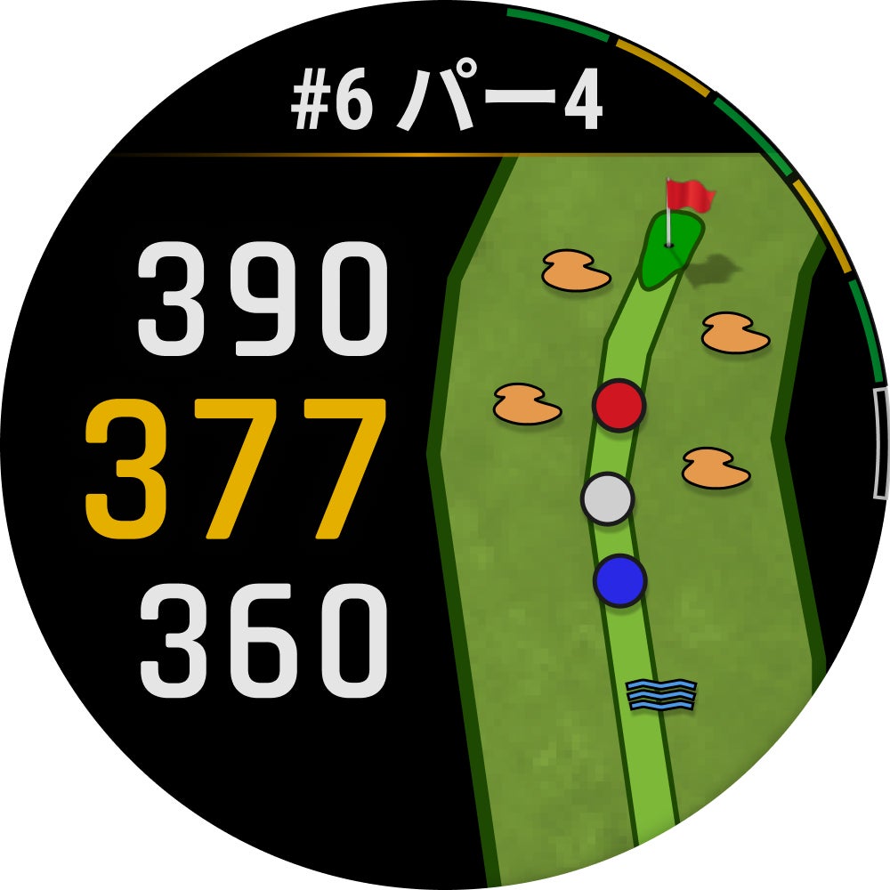 バンカーや池などの各ハザードまでの距離を表示。コース戦略に役立てることが可能です。