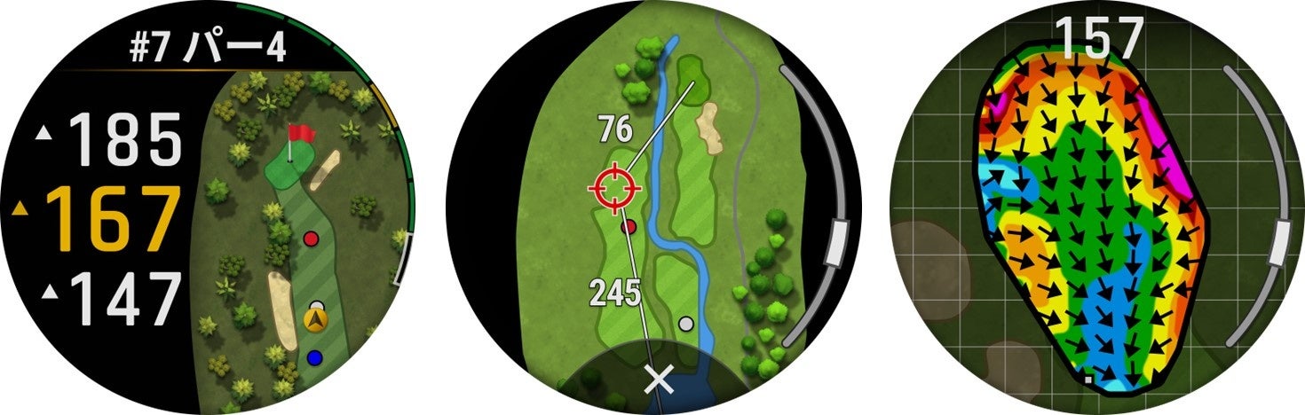 グリーンの傾斜方向や等高線を表示。パッティング時だけでなく、グリーンを狙うショットの戦略やクラブの選択に役立ちます。