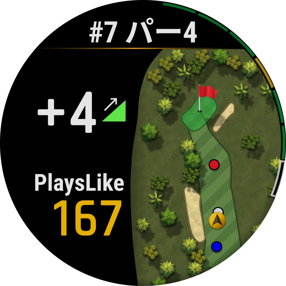 ラウンド中のショット(チップやパットを除く)を自動で検知。ショットの飛距離をラウンド中にリアルタイムで測定できます。距離感を正確に把握することで、クラブの選択や打ち方を最適化することが可能。また、各ショットの飛距離を記録し、スマートフォンの「Garmin Golf アプリ」で振り返ることができます。