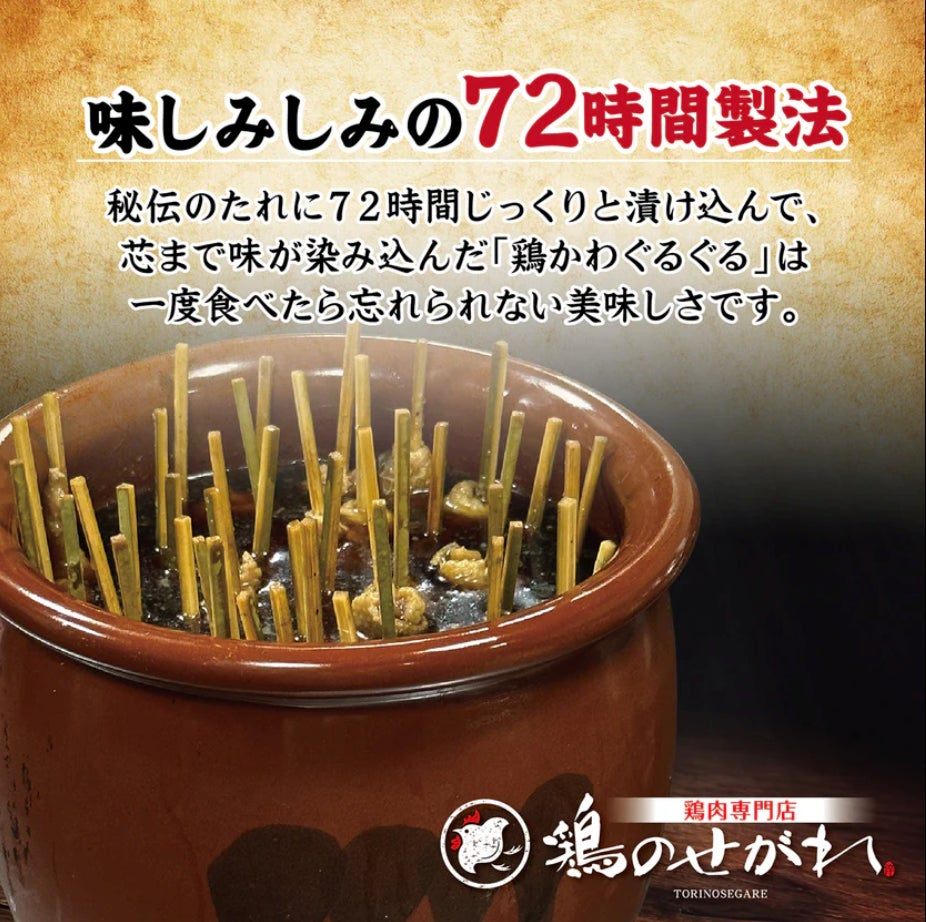 秘伝のたれに72時間じっくりと漬け込んで、芯まで味が染み込んだ「鶏かわぐるぐる」は、香ばしい炭火の香りと、噛むほどにじゅわっと広がる脂の旨味がたまりません。