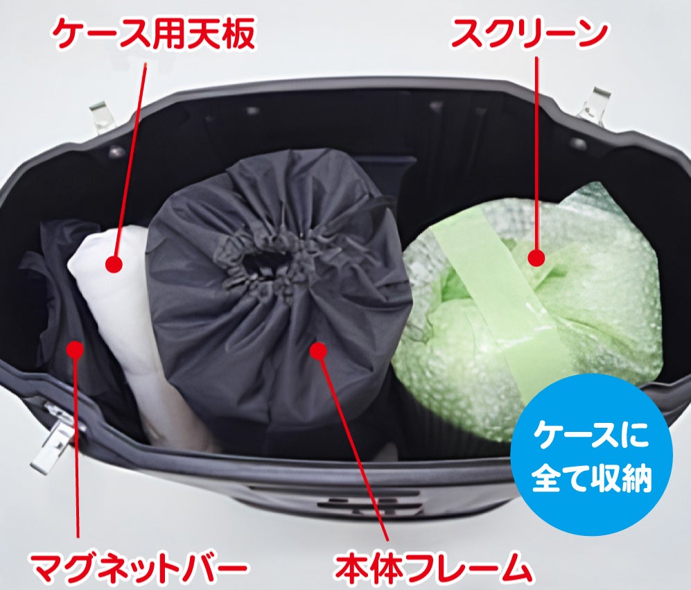 商品には専用ケースが付いていて、ケースには本体フレームとスクリーン、スポットライトなどの付属品もすべてを収納できます。