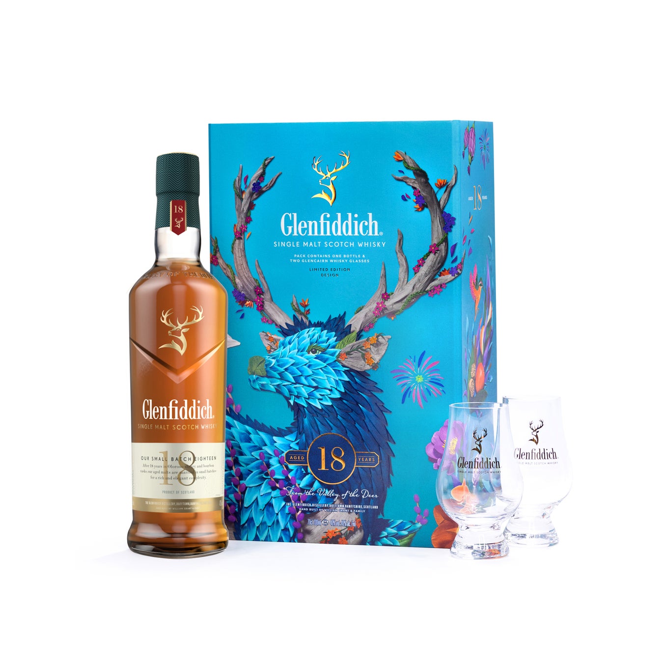 限定発売するギフトパッケージは、国際的に活躍する⽇本⼈アーティスト井上羅来氏がグレンフィディックのために描き上げたスペシャルなデザインボックスに、グレンフィディックの鹿のアイコンがデザインされたペアグラスをセットにしたものです。「グレンフィディック15年」にはペアタンブラーグラスが、「グレンフィディック18年」にはペアグレンケアングラスが付いています。