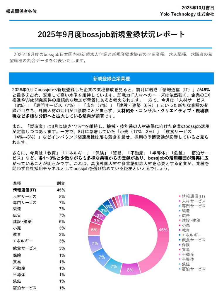 グローバル求人プラットフォーム「bossjob」を運営するYolo Technology株式会社(本社:東京都港区、代表:CHEAH JACK)は、2025年9月度の日本国内の新規登録企業および求職者の職種別・業種別傾向を公表いたしました。