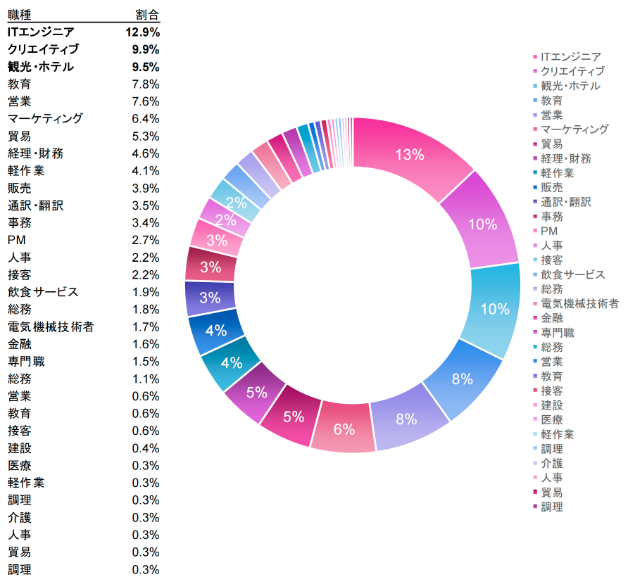 求職者の希望職種では、「ITエンジニア」が12.9%と前月(23%)から 大幅に減少した一方で、「クリエイティブ(9.9%)」「観光・ホテル(9.5%)」「教育(7.8%)」 「営業(7.6%)」など、非IT分野への関心が高まっている傾向が顕著に見られました。とりわけ、前 月1桁台だった観光・ホテルや教育関連職種が大きく伸びており、外国人求職者が自身の語学力や接 客スキル、専門知識を活かした職種への志向を強めていると考えられます。 また、「マーケティング(6.4%)」「貿易(5.3%)」「経理・財務(4.6%)」といった事務・国際 業務系の職種にも一定の人気が見られ、全体としてキャリア志向の職種希望が広がっているのが特徴 です。一方で、軽作業や飲食・接客といった従来人気のあった職種は軒並み低下傾向にあり、より専 門性やスキル活用を意識した志望傾向が強まっています。これらの傾向から、9月はITに集中してい た求職者の職種希望が多様化し、観光・教育・ビジネス職など幅広い分野への広がりを見せた月とな りました。
