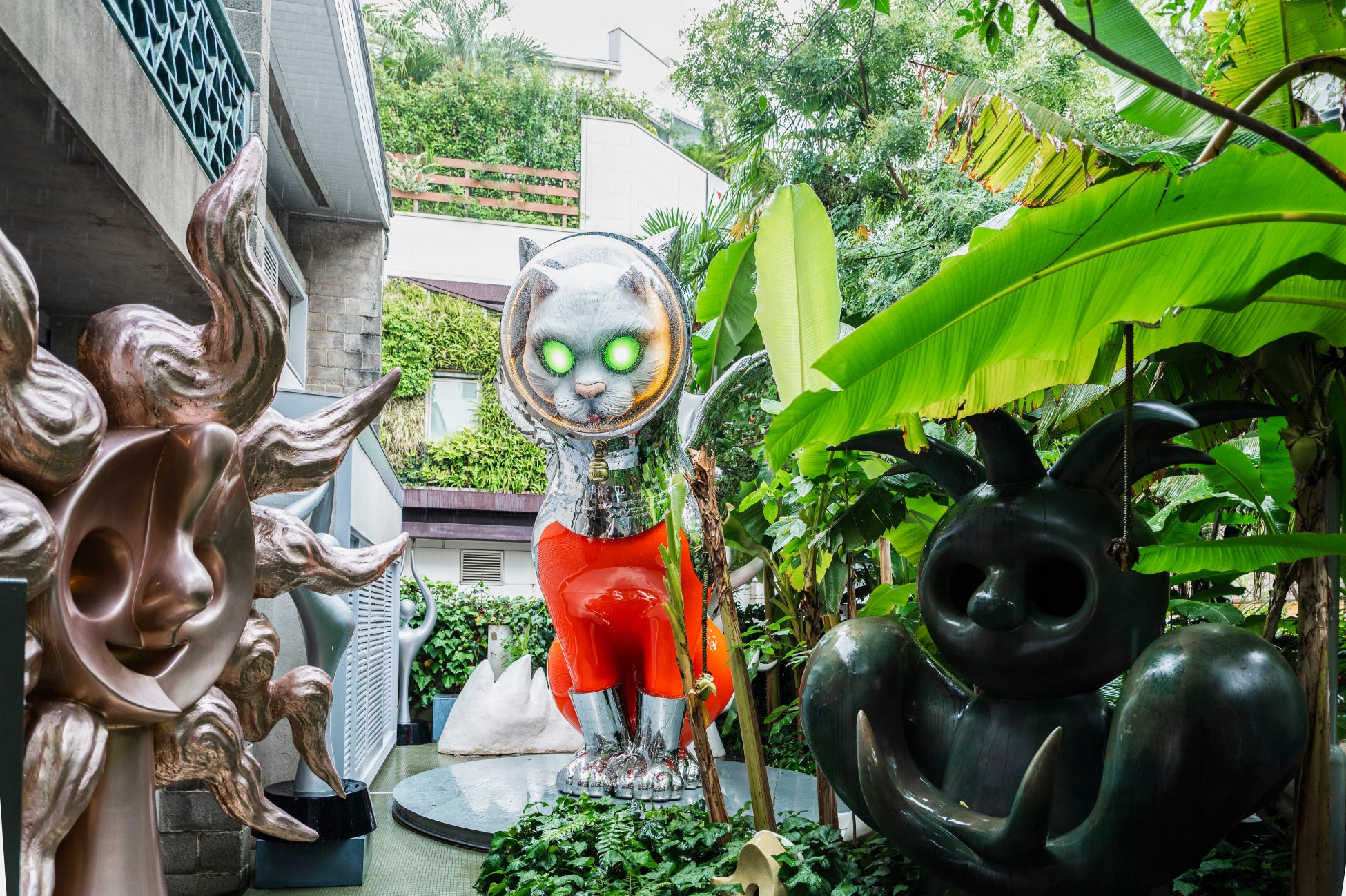 GINZA SIX中央の大きな吹き抜け空間を、地球を含む銀河と捉え、岡本太郎の「太陽の塔」へオマージュを捧げた宇宙船と無数の宇宙猫が宙を舞う。館内には、「SHIP’S CAT」シリーズの彫刻作品を展示。