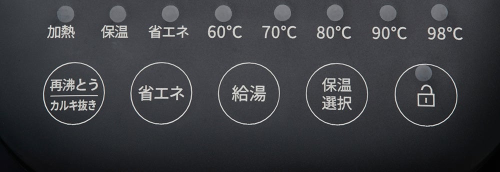 60℃~98℃まで約10℃単位の5段階での温度調節が可能で、緑茶や紅茶、コーヒーなど、飲み物ごとに最適な温度でお湯を出せます。保温などの設定温度を変更することができるため、お客様の使用スタイルに合わせて自由にお選びいただけます。