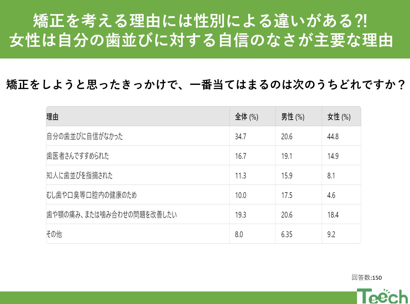 このアンケート結果から、矯正を考える理由には性別による違いがあることが見えてきました。男性は歯や顎の痛みや噛み合わせの問題、歯医者の勧めやむし歯・口臭等の口腔内の健康問題が主な要因である一方、女性は自分の歯並びに対する自信のなさが主要な理由となっています。これらの結果を参考に、矯正治療の動機付けやカウンセリングの際に性別によるアプローチの違いを考慮することが重要であると言えるでしょう。