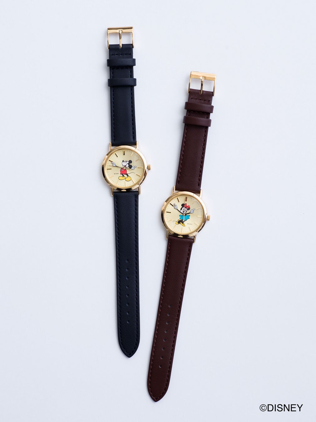 ミッキーマウスやミニーマウスと共に長い時間を刻めるように、永く愛用できる上質な腕時計にデザインしました。文字盤はゴールドを基調に、ベルトは重厚感のある落ち着いたレザーを使用しています。ミッキーマウスはネイビー、ミニーマウスはブラウンカラーで展開します。短針と長針を腕で表現することで、時間によって動くミッキーやミニーをお楽しみいただけます。飽きのこないシンプルなデザインで、親から子へ世代を超えて受け継ぐことのできる腕時計が完成しました。