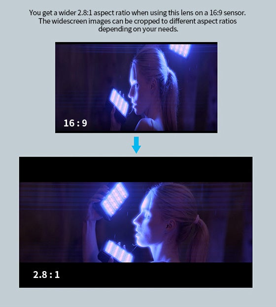 このレンズを16:9センサーで使用すると、より広い2.8:1のアスペクト比が得られます。広いスクリーンの画像は、必要に応じて異なるアスペクト比にクロップすることができます。