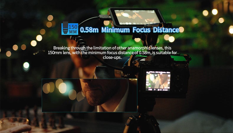 他のアナモルフィックレンズと比べて、この150mmレンズは最短撮影距離が0.58mという制約を超えており、クローズアップ撮影に最適です。