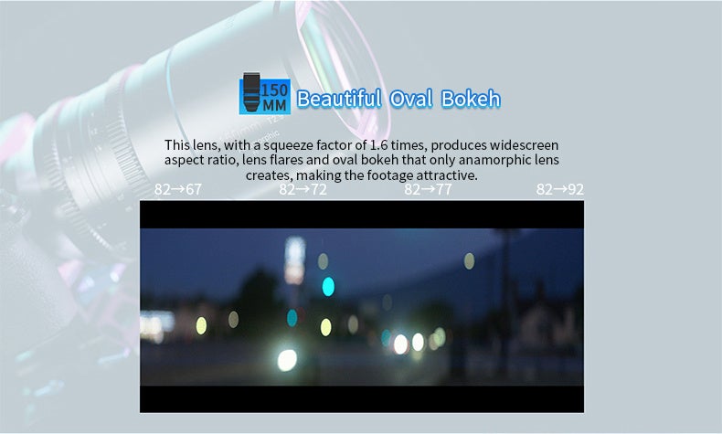 このレンズは1.6倍のスクイーズファクターを持ち、アナモルフィックレンズ特有のワイドスクリーンのアスペクト比、レンズフレア、そして美しい楕円形のボケを生み出し、撮影映像に魅力を与えます。