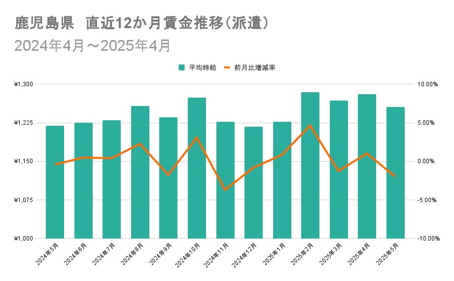 鹿児島県では直近12か月で平均賃金が1,217円から1,284円の間で推移しており、最大でも前月比+4.65%、最も下落した月で-3.69%でした。