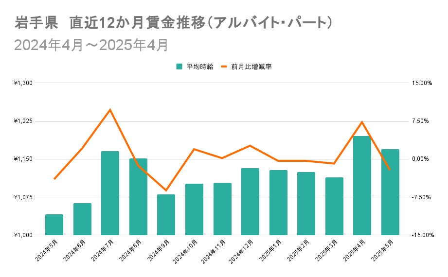 岩手県では、2024年6月から7月および2025年3月から4月にかけて、複数の企業が高時給の塾講師求人を掲載したことで平均時給が一時的に大きく上昇しました。しかし、5月にはこうした求人が減少し、平均賃金も前月比で26円下落しています。新学期に向けた求人需要が一巡したことが影響していると考えられます。