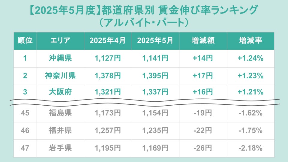 アルバイト・パートの都道府県別賃金伸び率ランキング(前月比)トップ3は、1位が沖縄県(増加額+14円、増加率+1.24%)、2位が神奈川県(増加額+17円、増加率+1.23%)、3位が大阪府(増加額+16円、増加率+1.21%)でした。