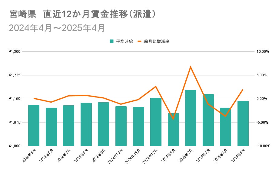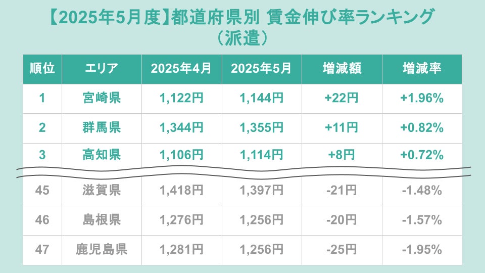 求人サイト主要9媒体から雇用形態別に分析!派遣では宮崎県が前月比+1.96%で1位【2025年5月度 都道府県別 賃金伸び率ランキング】