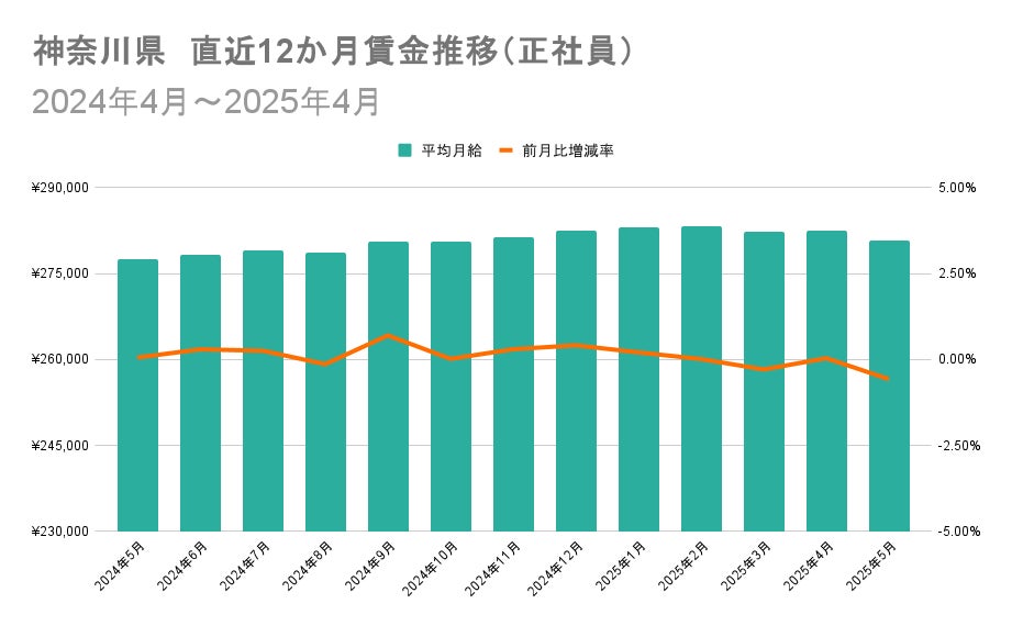 神奈川県では平均月給27万5千円以上の水準を維持しながら横ばいで推移しています。