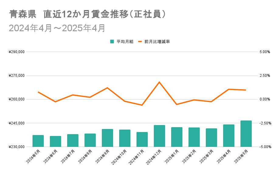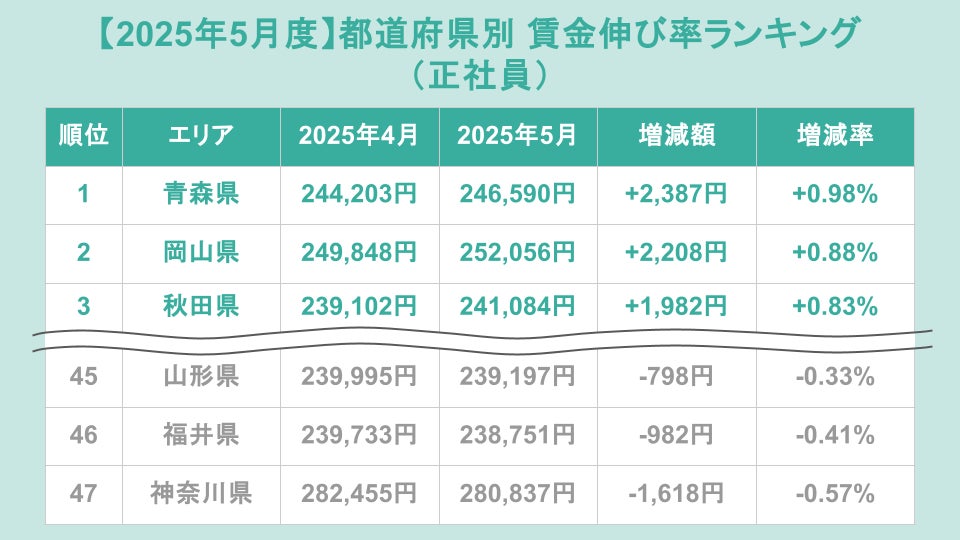 正社員の都道府県別賃金伸び率ランキング(前月比)トップ3は、1位が青森県(増加額+2,387円、増加率+0.98%)、2位が岡山県(増加額+2,208円、増加率+0.88%)、3位が秋田県(増加額+1,982円、増加率+0.83%)でした。