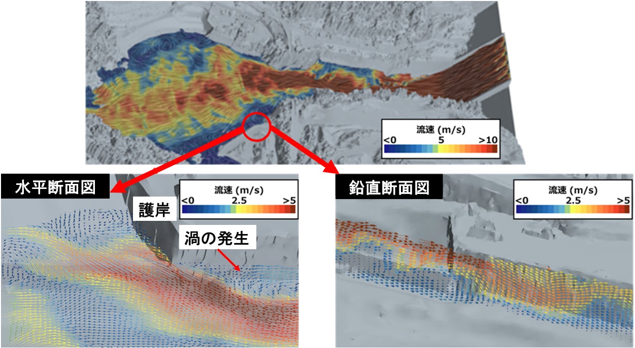 丸山ダムの放流設備(ゲート)から下流の河道をモデル化し、放流時の流量を想定した解析を行いました。その結果、ダム下流の施工現場付近における最大水位を精度良く予測し、再開発現場の被災リスクを見積もることができました。また、BIM/CIM活用により河床形状を高精度に解析することができ、3次元的な放流時の流れを詳細に分析することが可能となりました。具体的には、上流からの流れが護岸に衝突することによって生じる渦を巻く流れの様子や、同じ場所でも水面と川底では流れの速さが異なっている状況などを、断面図で把握できます。