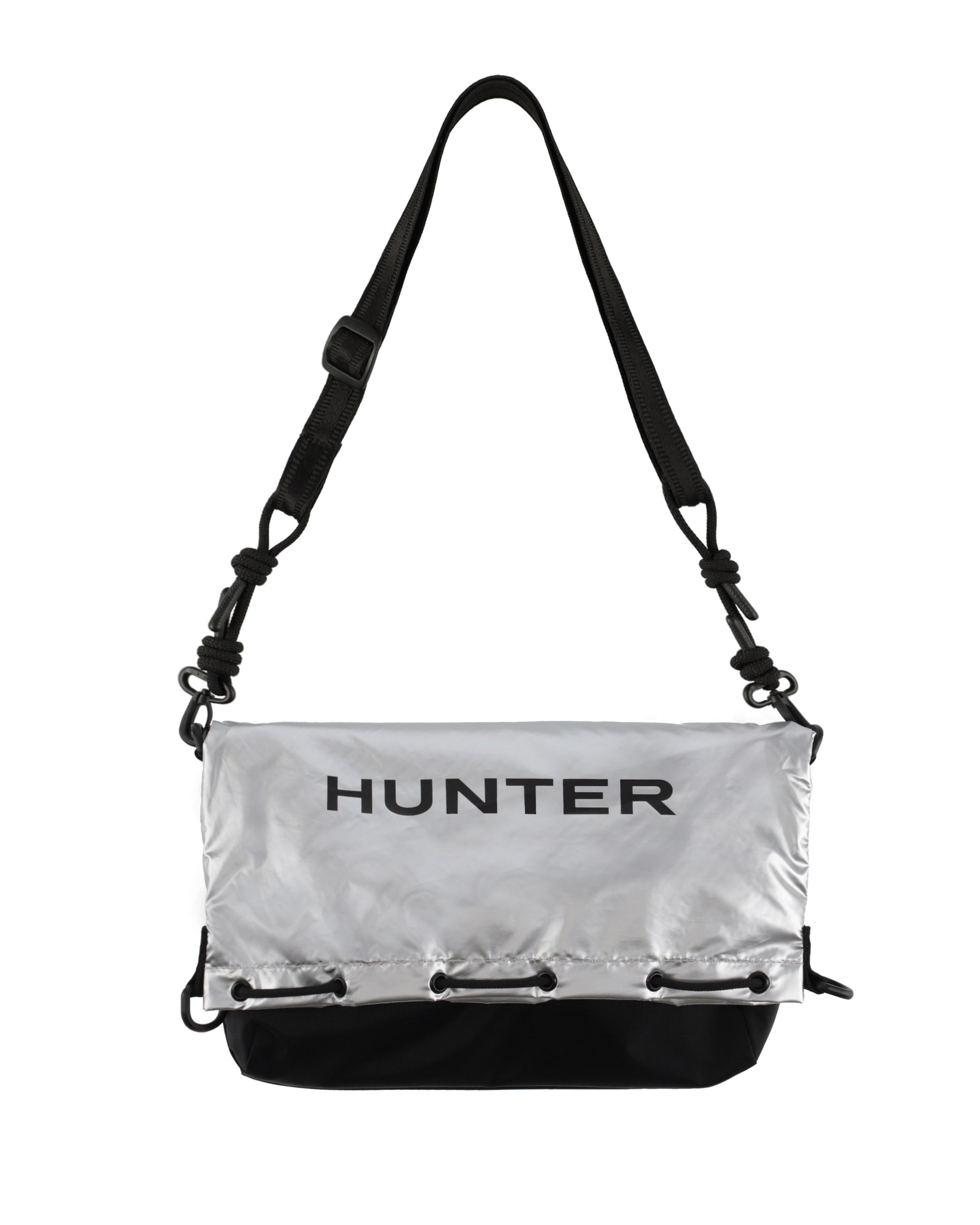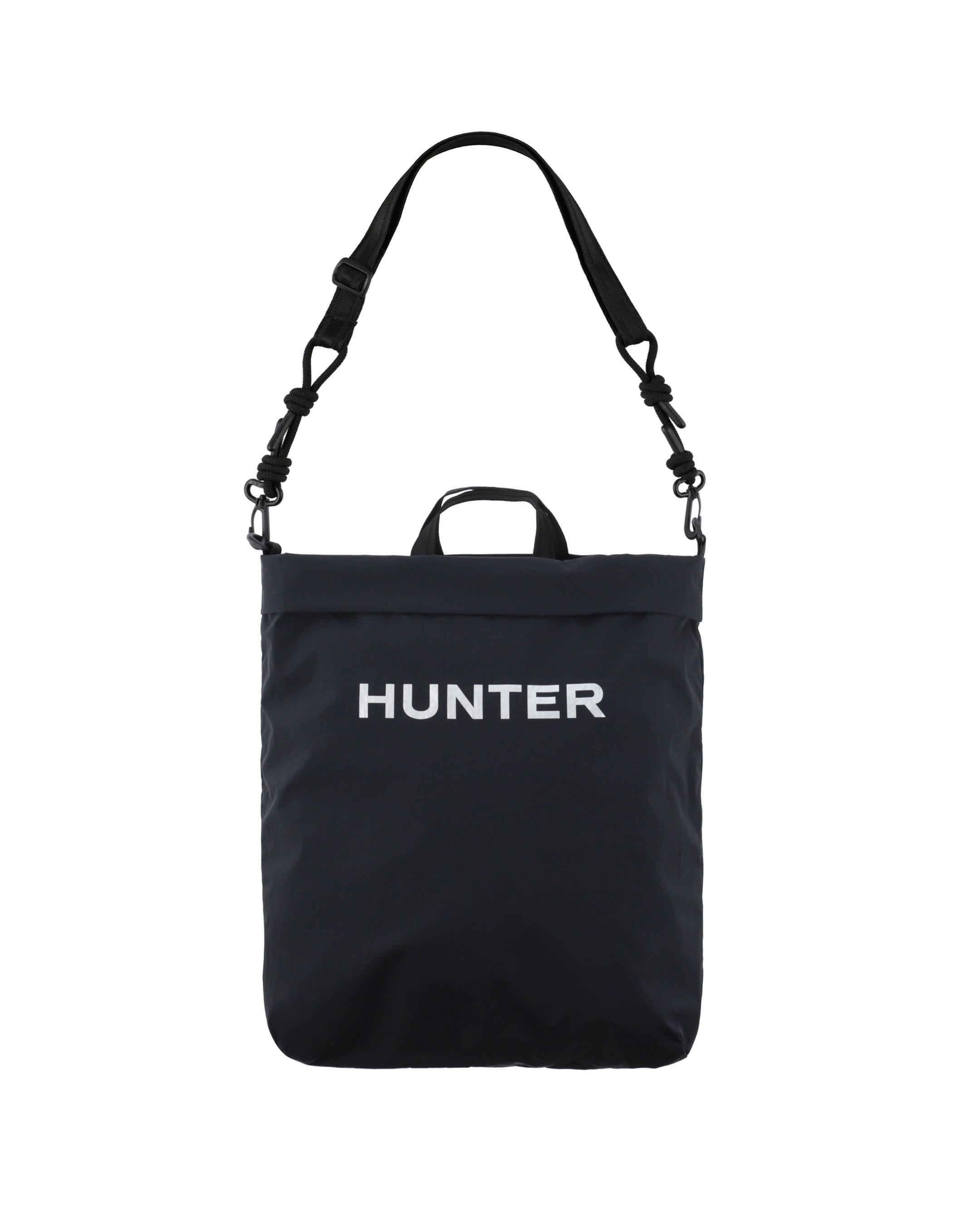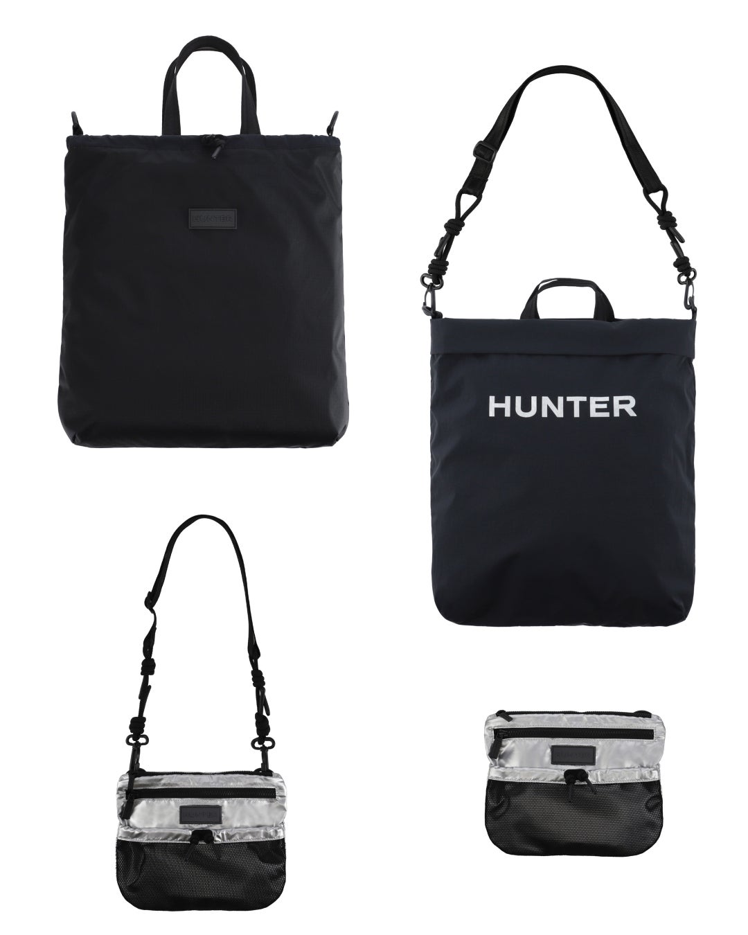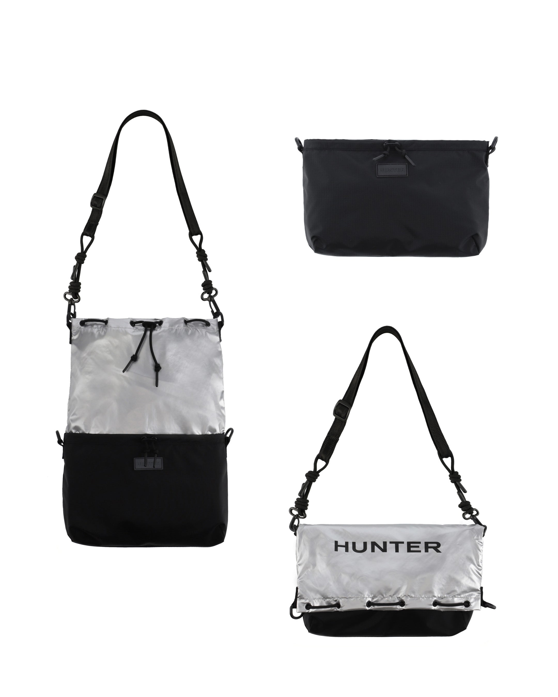 トラベルマルチファンクションサコッシュは、シーンに合わせて2パターンのサコッシュとトートバッグとして使用できます。本体を半分に折りたたみ、折り目横の留め具にストラップを付ければサコッシュへと変身します。気分に合わせて、①PVCロゴを表に出すスタイル、②プリントHUNTERロゴを表に出す2パターンのスタイルが楽しめます。メインコンパートメントには小物収納に便利な内ポケット付き。③本体を折らずに開口部横の留め具にストラップをつければトートバッグへと変身します。A4サイズも収納可能で出先で荷物が増えたときにも使い勝手が良く重宝するアイテムです。
