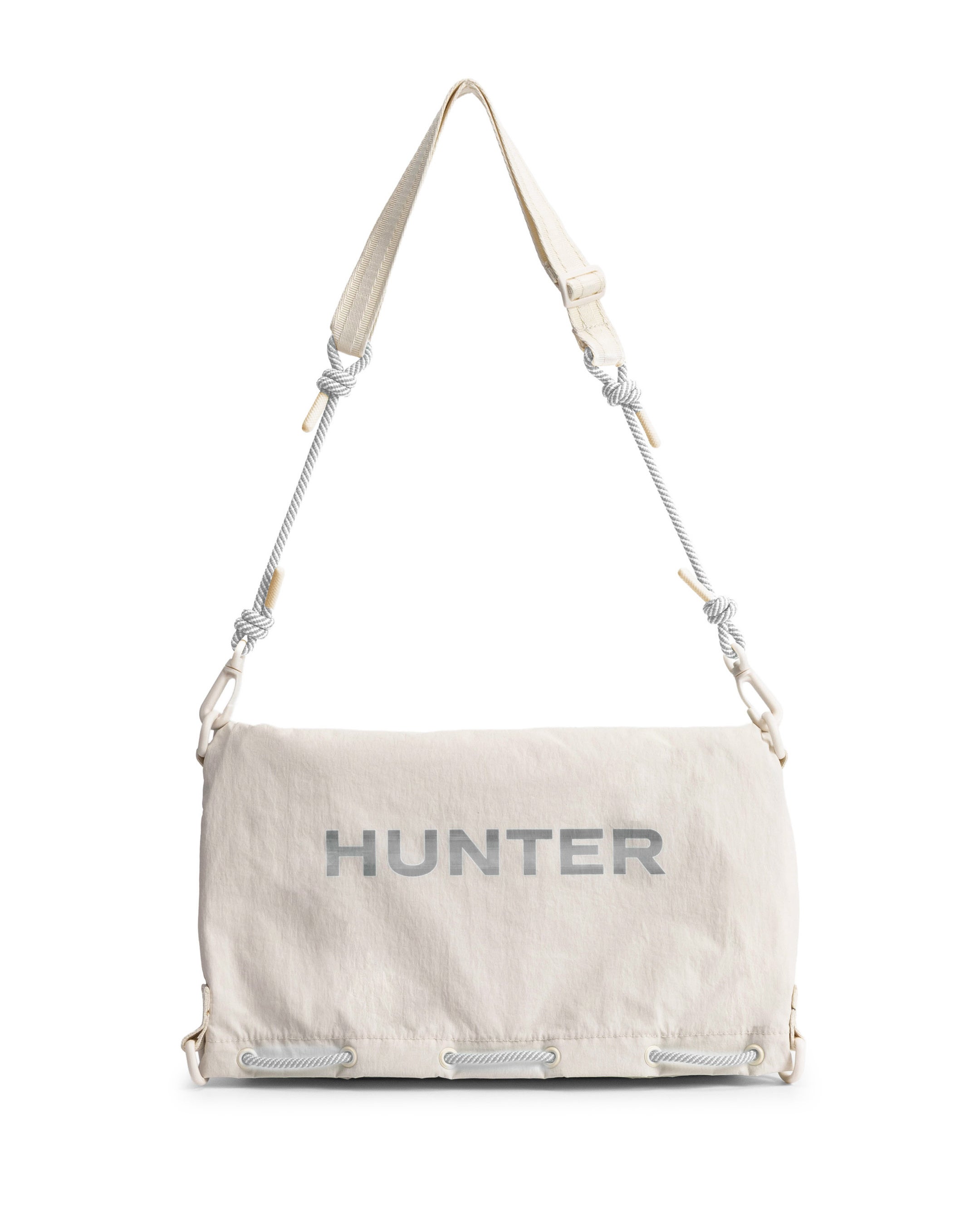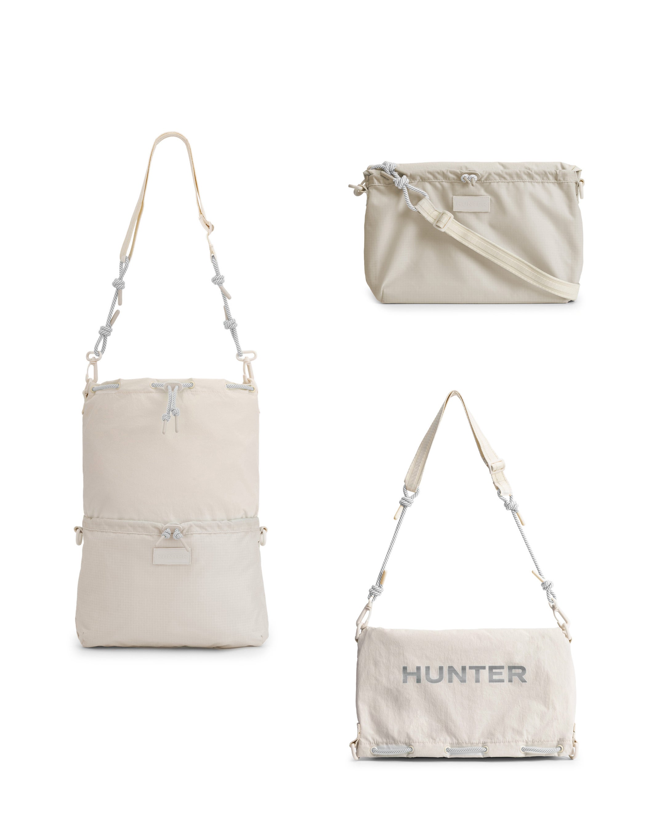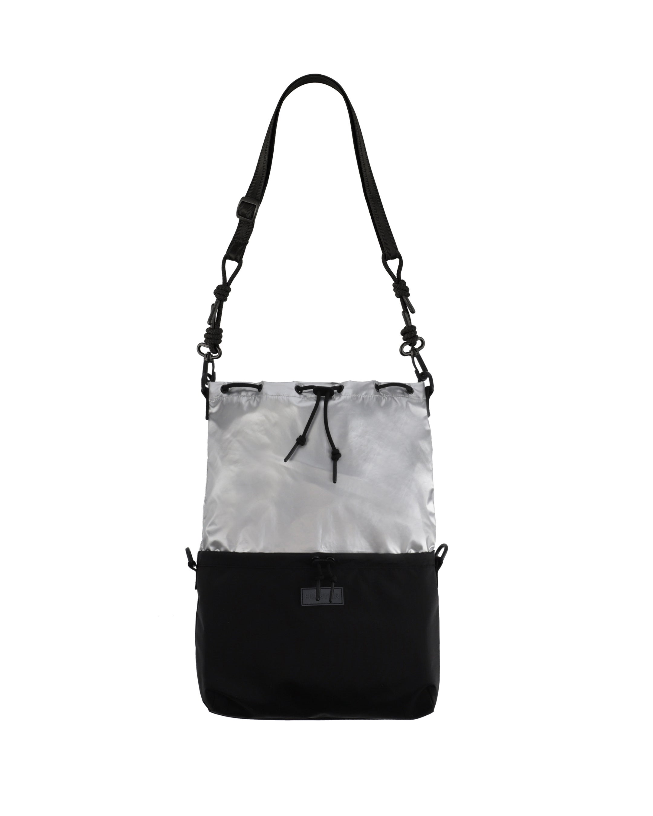 トラベルマルチファンクションサコッシュは、シーンに合わせて2パターンのサコッシュとトートバッグとして使用できます。本体を半分に折りたたみ、折り目横の留め具にストラップを付ければサコッシュへと変身します。気分に合わせて、①PVCロゴを表に出すスタイル、②プリントHUNTERロゴを表に出す2パターンのスタイルが楽しめます。メインコンパートメントには小物収納に便利な内ポケット付き。③本体を折らずに開口部横の留め具にストラップをつければトートバッグへと変身します。A4サイズも収納可能で出先で荷物が増えたときにも使い勝手が良く重宝するアイテムです。