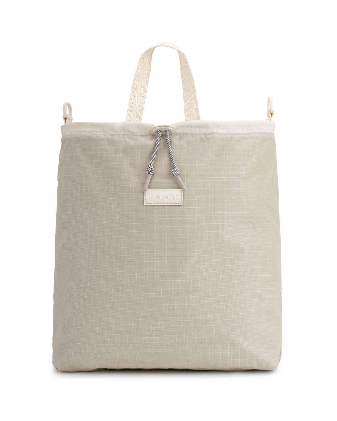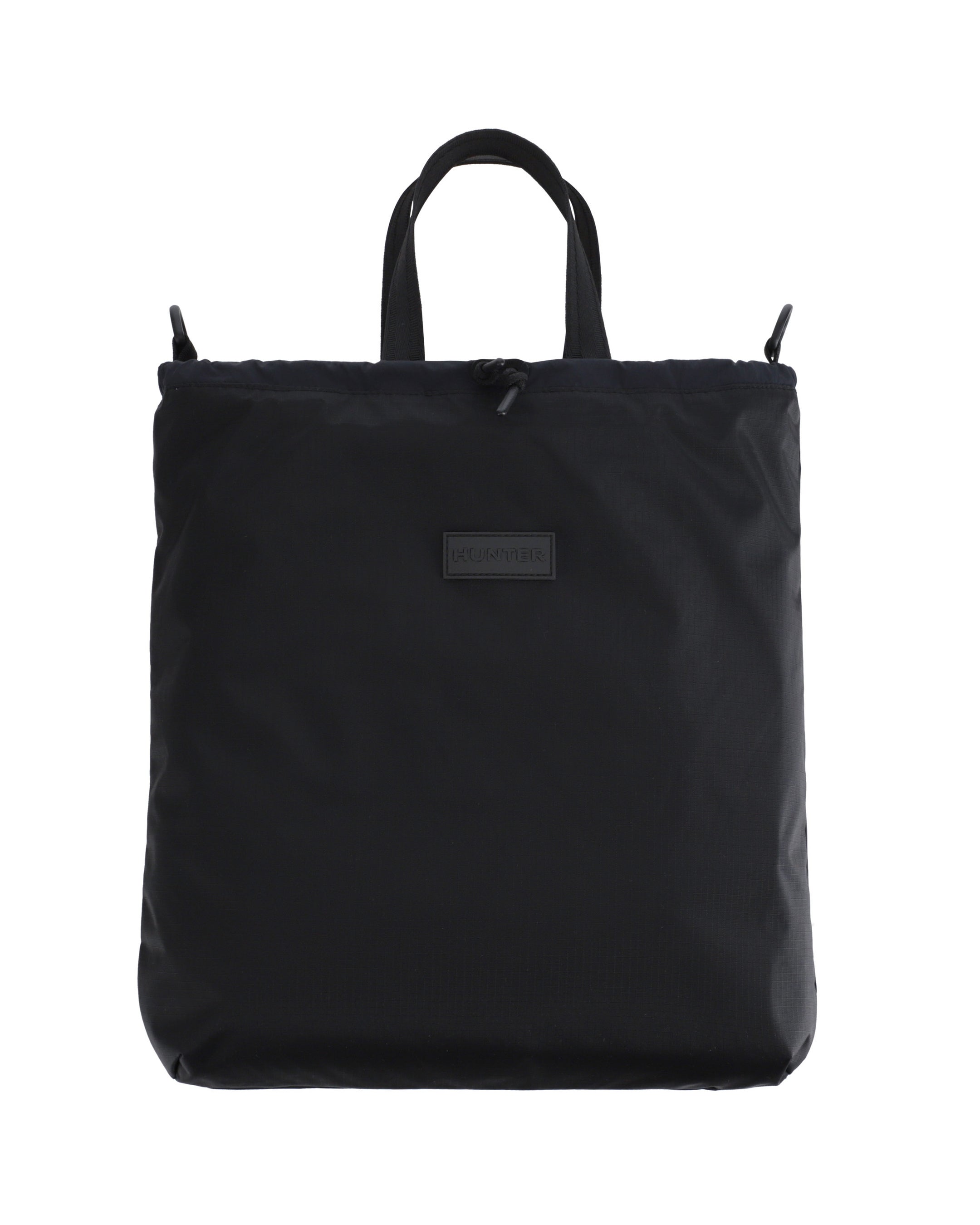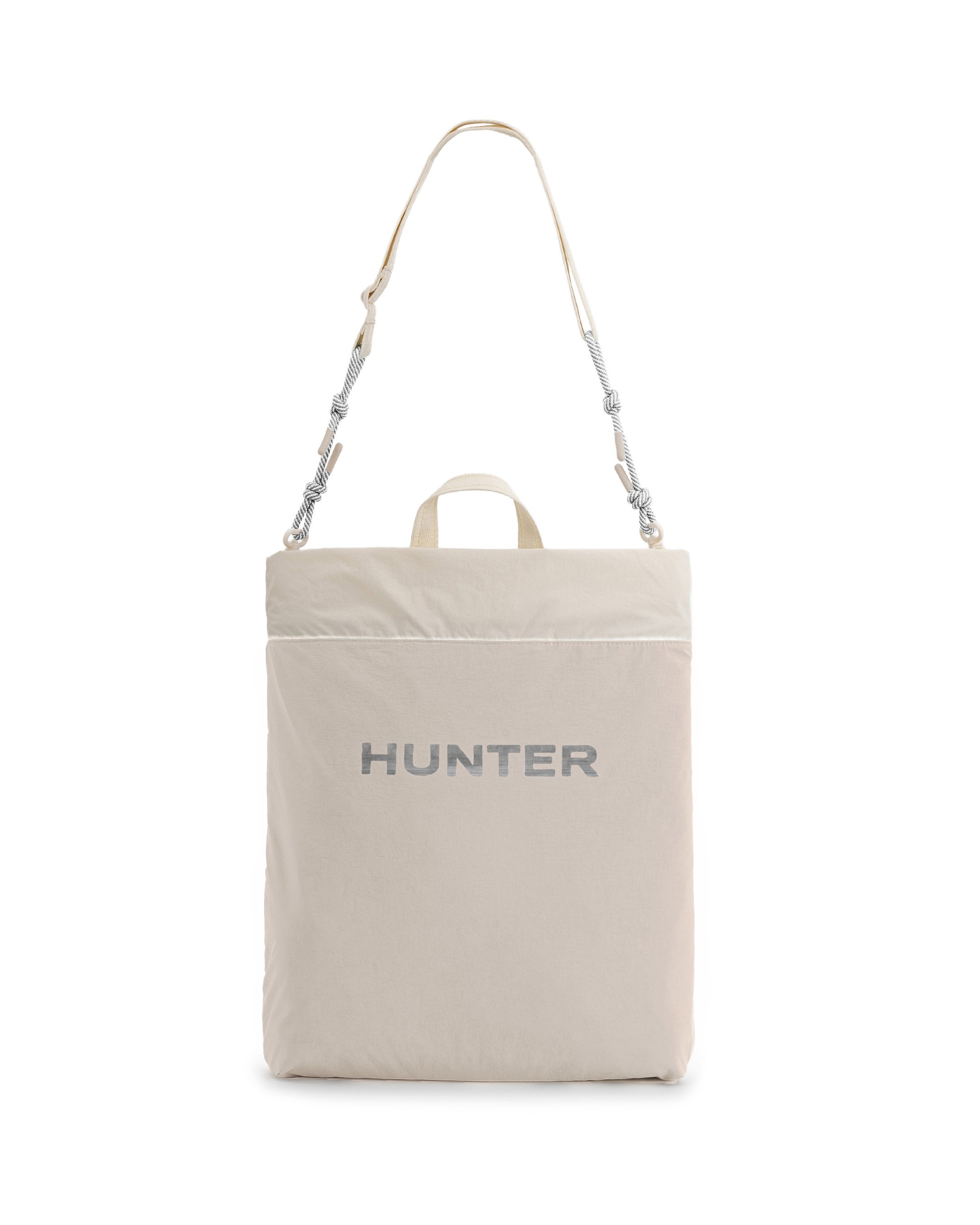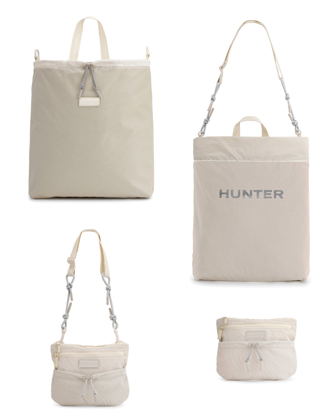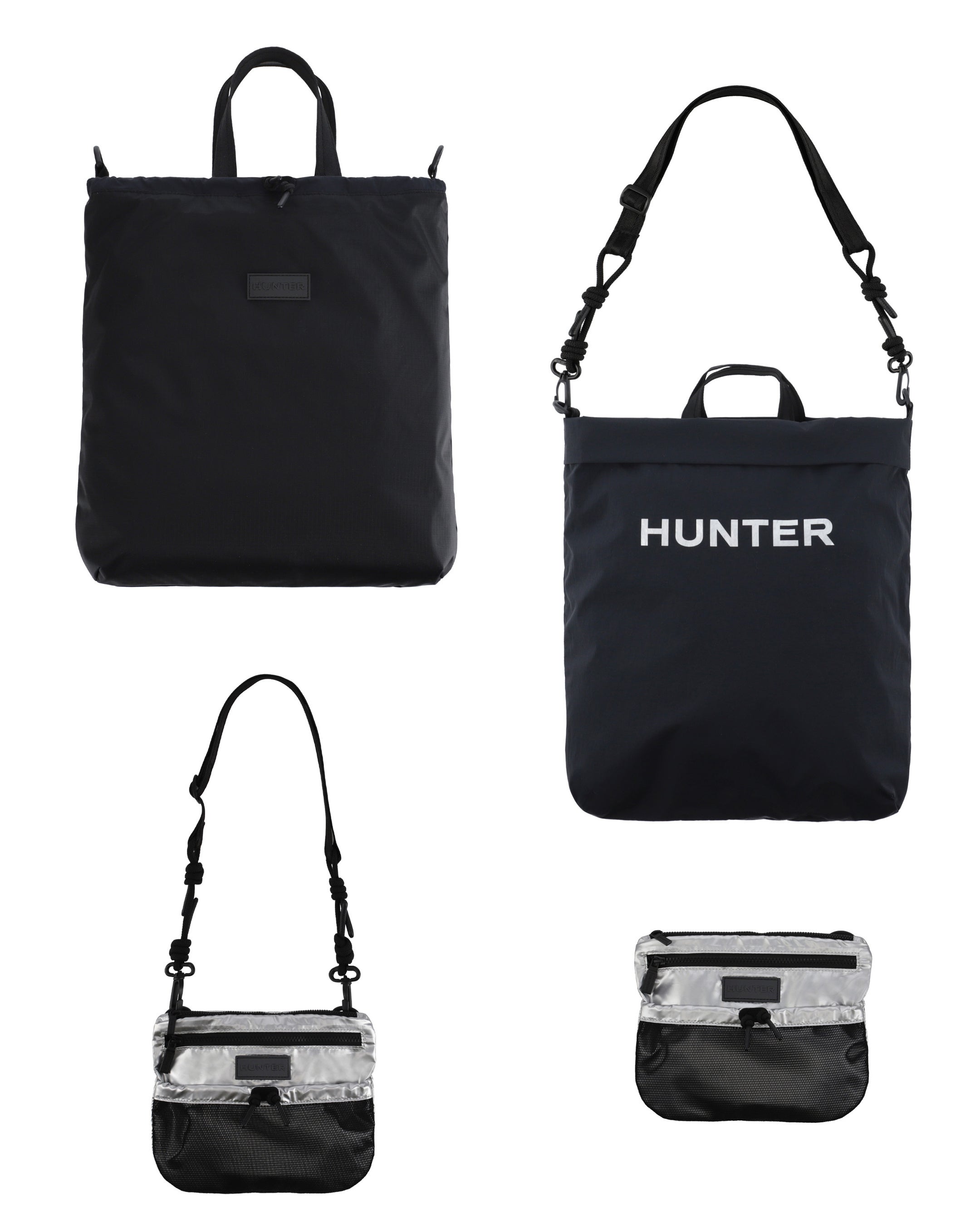 トラベルマルチファンクショントートは、シーンに合わせてトートバッグ(2スタイル)とミニクロスボディバックの3WAYでの使用が可能です。トートバッグはリバーシブル仕様でA4サイズやPCも十分に収納可能なサイズ感となっており、①PVCロゴを表にしたスタイル、②大きめのプリントHUNTERロゴを表にした2パターンのスタイルが楽しめます。③収納袋にバックパックのショルダーストラップを取り付けるとミニクロスボディバックとしても使用できます。④付属の収納袋は取り外し可能となっており、小物などを収納する単体のミニポーチとしても使用可能です。