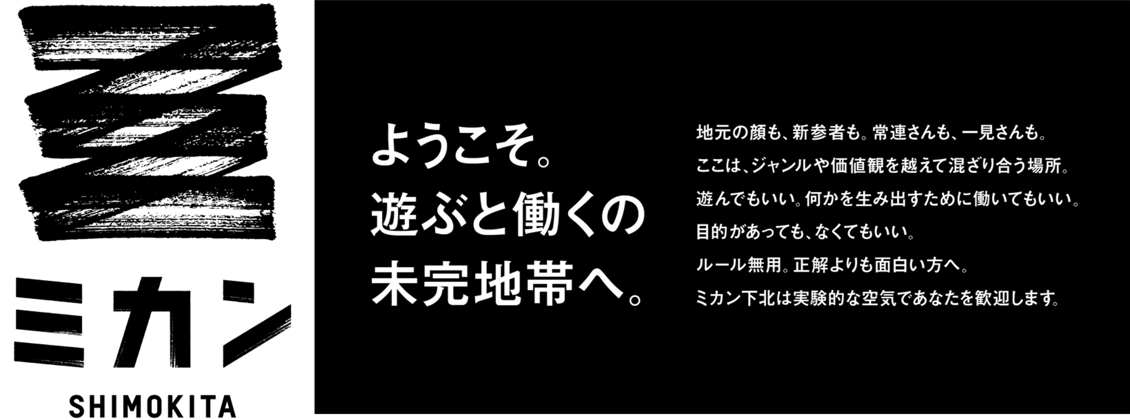 ミカン下北は「ようこそ。遊ぶと働くの未完地帯へ。」というプロジェクトコンセプトの下、下北沢の自由で雑多な空気の中で、多様な人々がジャンルや価値観を超えて混ざり合い、予想もつかない何かが生まれる場所を目指し、2022年3月に開業しました。施設名称である「ミカン下北」には、多様な文化が交差し、絶えず自由に編集され、変わり続ける、つまり“常に未完である”ことに下北沢の普遍的な魅力を見出し、未完ゆえに生まれる新たな実験や挑戦を促す想いが込められています。