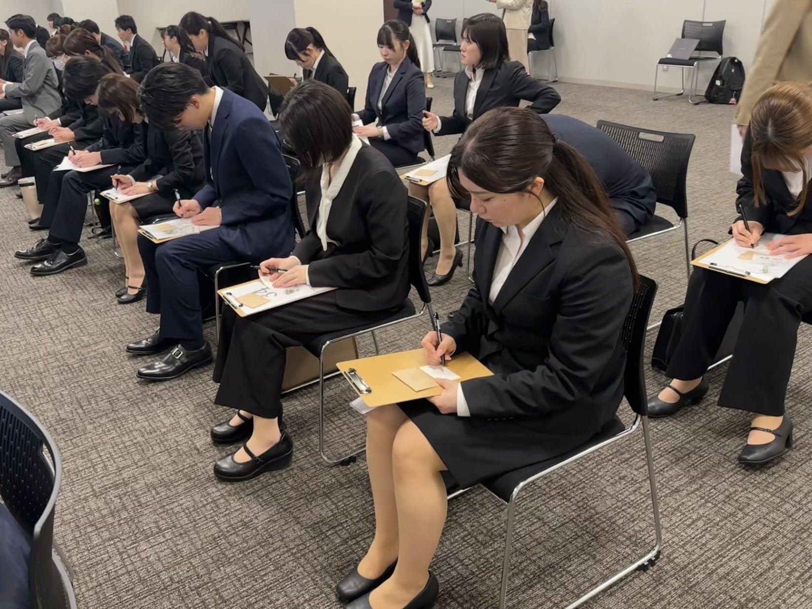 入社式当日、新入社員はまず「半年後の自分に対してメッセージを贈る」ことから始めました。半年後の研修にて返却されるメッセージカードに、ある人はじっくり悩みながら、ある人はすぐに筆を取り記入していく様子から、それぞれの個性や入社式という日に向けている思いが伝わってくるようでした。