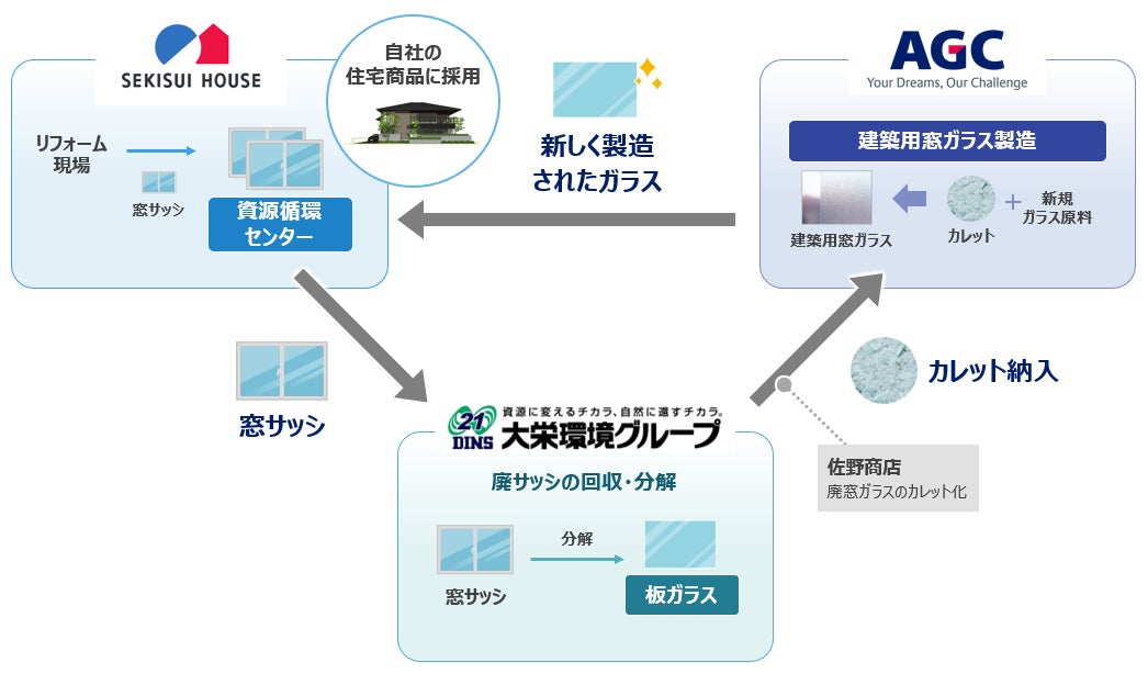 積水ハウス株式会社(社長:仲井 嘉浩、以下「積水ハウス」)、大栄環境株式会社(社長:金子 文雄、以下「大栄環境」)、AGC株式会社(社長:平井 良典、以下「AGC」)の3社は、住宅*1の改修工事に伴い発生する廃サッシから窓ガラスを回収し、元の窓ガラスと同等品質の窓ガラスへ再生する水平リサイクルの実証実験を2026年3月より関西圏で開始します。ハウスメーカー・リサイクラー・ガラスメーカーが連携して窓ガラスを水平リサイクルする循環型モデルは国内初です。