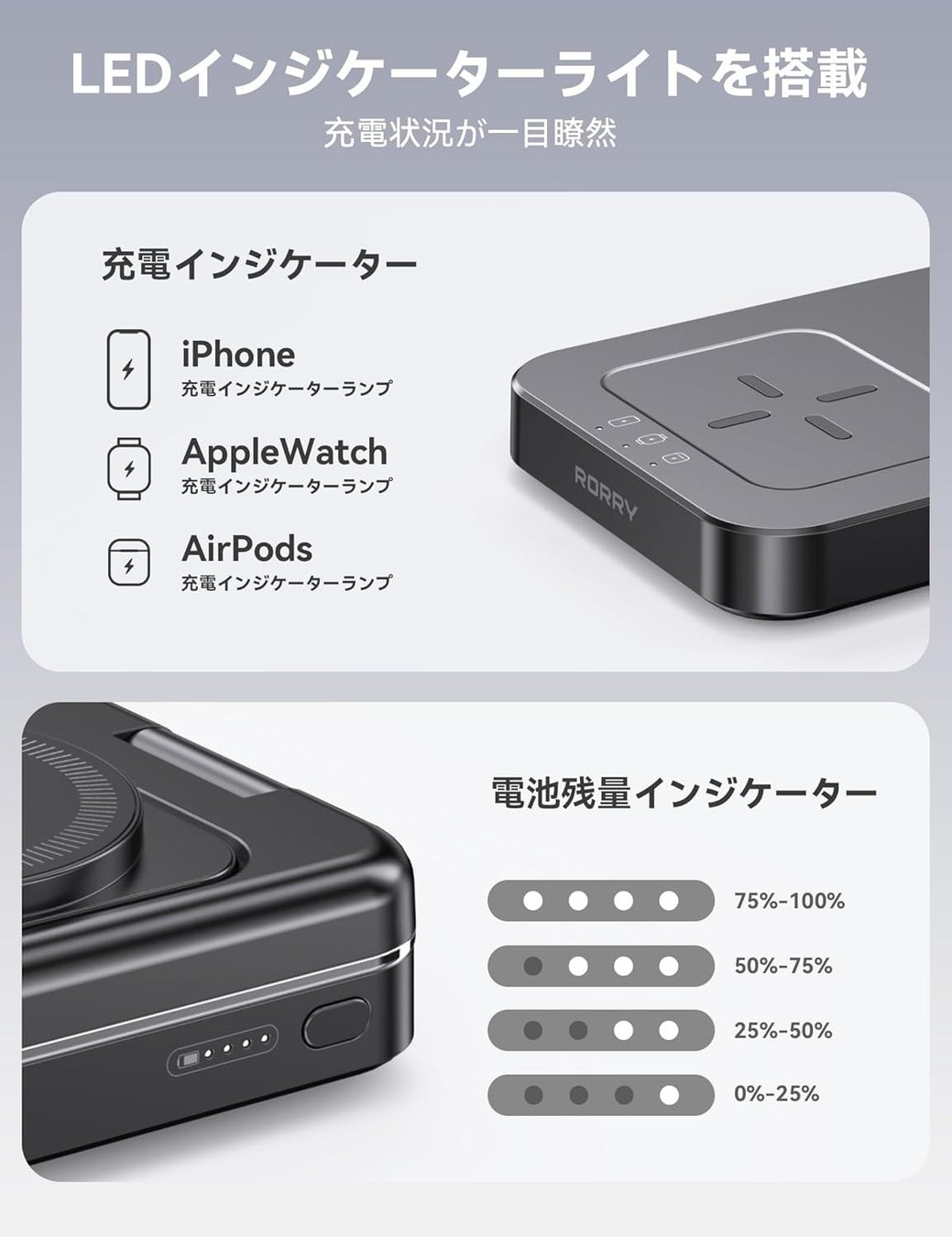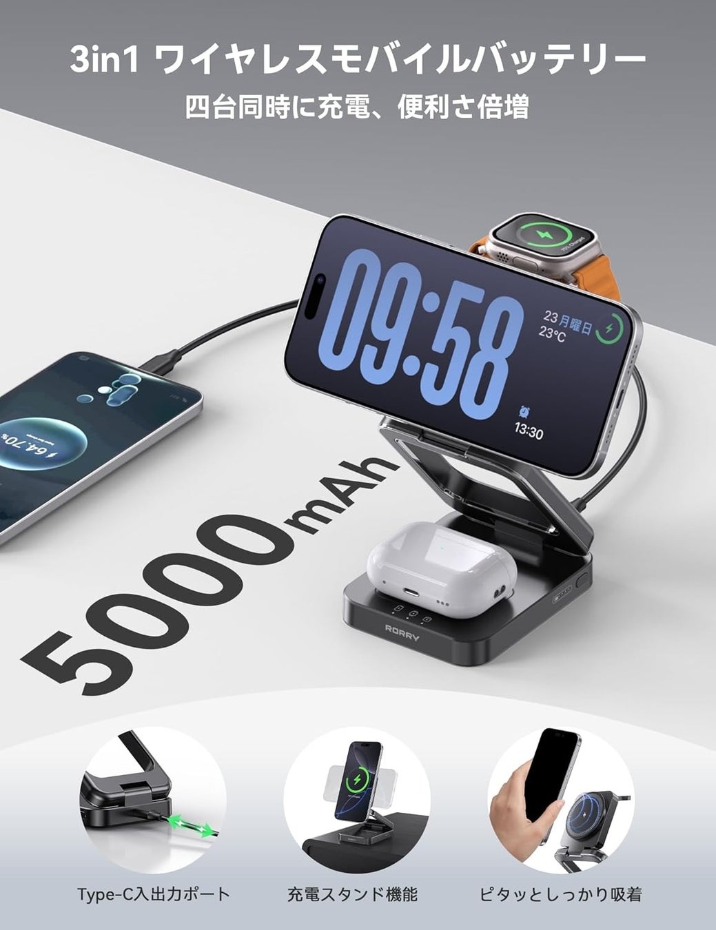 対象製品:RORRY スタンド型3in1ワイヤレス充電モバイルバッテリー D17(5000mAh)
