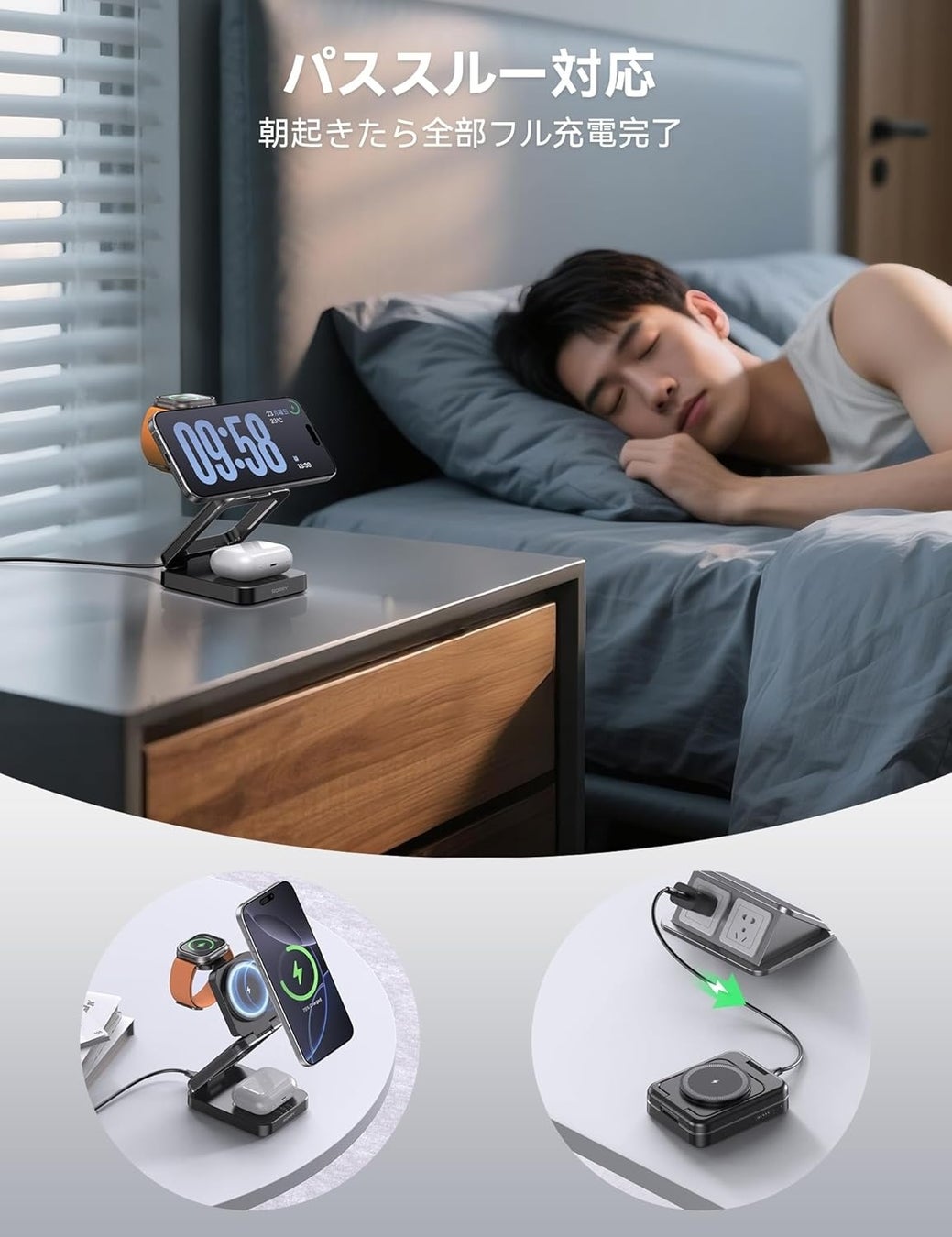 D17はパススルー充電対応。夜間、充電器本体を充電しながら3台のデバイスにも同時給電でき、朝起きたときにはすべてが満充電という快適な日常をサポートします。