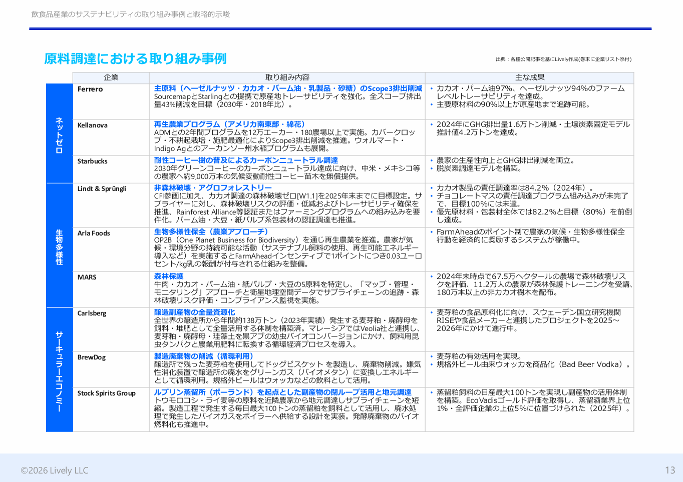 Lively合同会社(本社:東京都千代田区、Founder & CEO:種田 毅、Co-Founder & Co-CEO:三浦 友見)は、サステナブルな未来に向けたビジョンと先見力を育むことを目的としたレポート・シリーズ、第8回となるレポート「飲食品産業のサステナビリティの取り組み事例と戦略的示唆」を、Livelyの公式Webサイトにて公開しました。