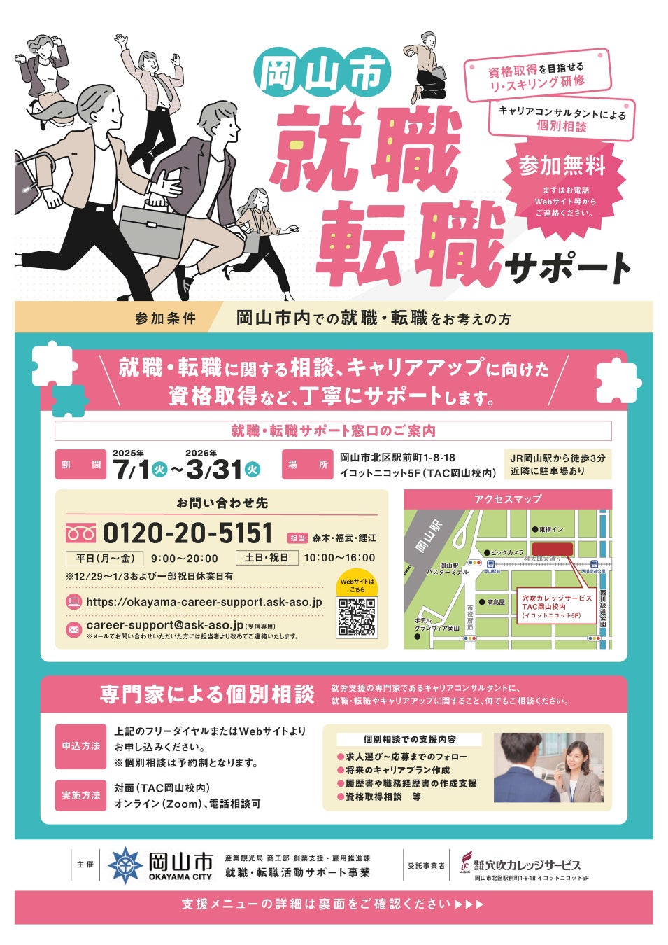 岡山市は、令和6年度までの就職氷河期世代への就職支援に代わり、令和7年度から、就職氷河期世代を含む中高年層を始め、幅広い世代を対象とする「就職・転職サポート事業」を開始します。
