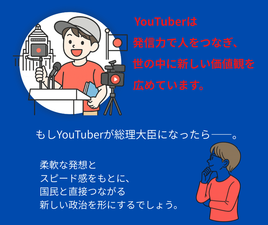 動画で人をつなぐYouTuberが、もしも総理大臣になったら…。発信力と影響力で政治を動かす『YouTuber総理』が妄想総理シリーズ職業編第10弾として登場しました。