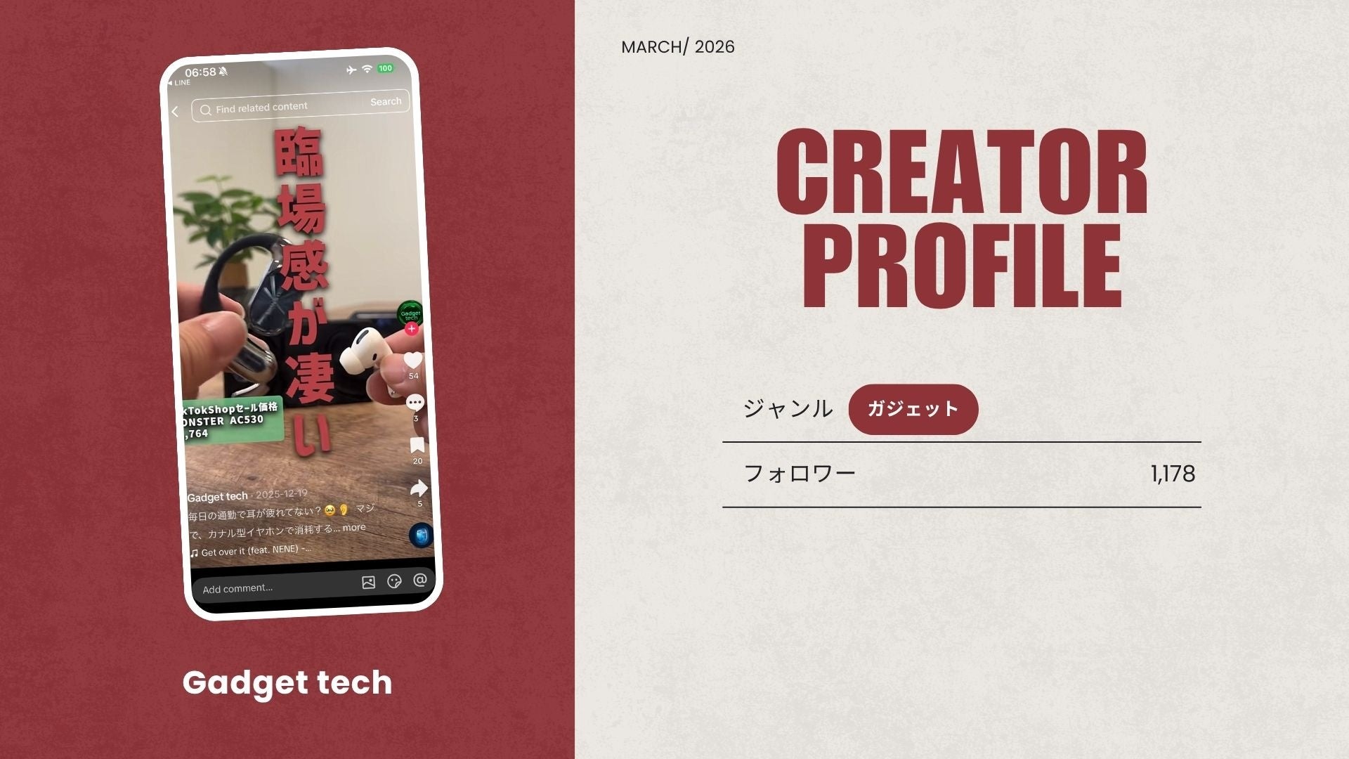 「Gadget tech」は、最新ガジェットやデジタルプロダクトを中心に取材を行い、動画の制作・発信をしています。これまでの投稿の中には、再生回数12万回を超える動画も。ガジェット分野に強みを持つ同メディアの加盟により、新商品や最新テクノロジーの魅力を分かりやすく伝え、認知拡大や購買意欲の向上が期待できます。