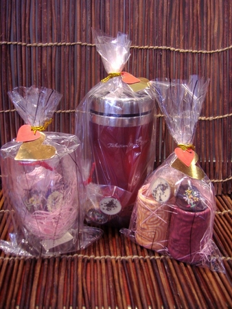 ノニジュースのシロップが入ったミルクチョコレートと、ノニ茶葉をトッピングしたホワイトチョコレートにタヒチアンノニ カフェオリジナルグッズをセットにしたギフト。