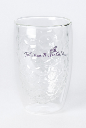 タヒチアンノニ カフェのロゴが入ったグラス。ノニ果実をイメージしたデザイン。