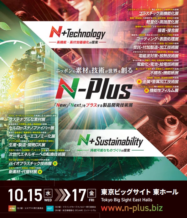 エヌプラス事務局は、展示会『エヌプラス2025』を2025年10月15日(水)から17日(金)、東京ビッグサイトにて開催いたします。「ニッポンの素材と技術が世界を創る」をテーマに掲げ、「New」「Next」をプラスする製品開発技術展として、16回目の開催を迎える。2月より出展申込受付を開始している! https://www.n-plus.biz/